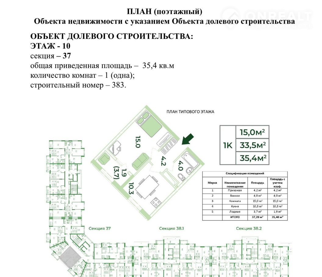 1-комнатная квартира, 37.2 м2, этаж 10 / 19, на продажу в селе Мирном