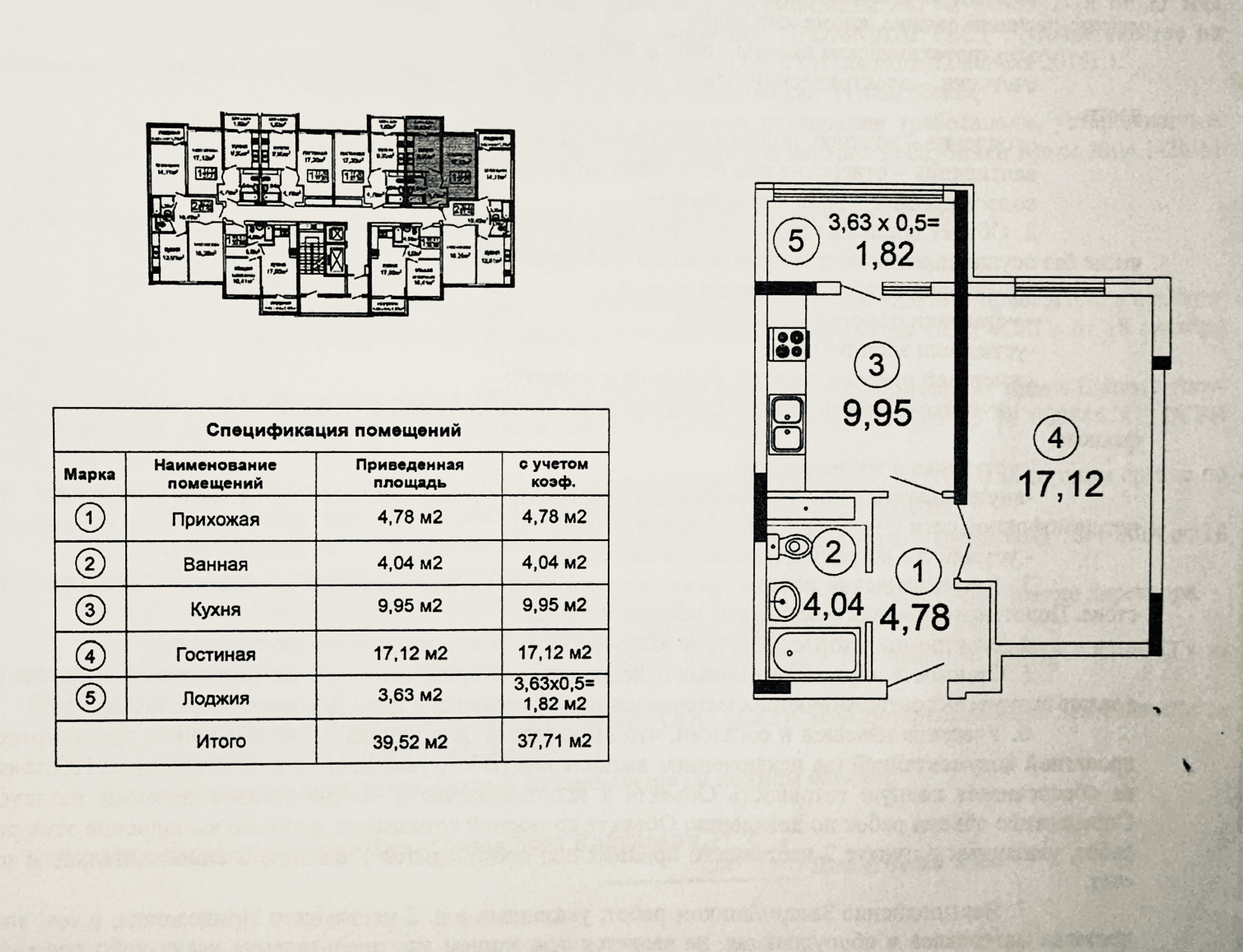 Общая площадь с лоджией 39.52 м2, лоджия 3.63 м2, просторная кухня 9.95 м2, комната 17.12 м2. Совмещённый сан. узел 4.04 м2.