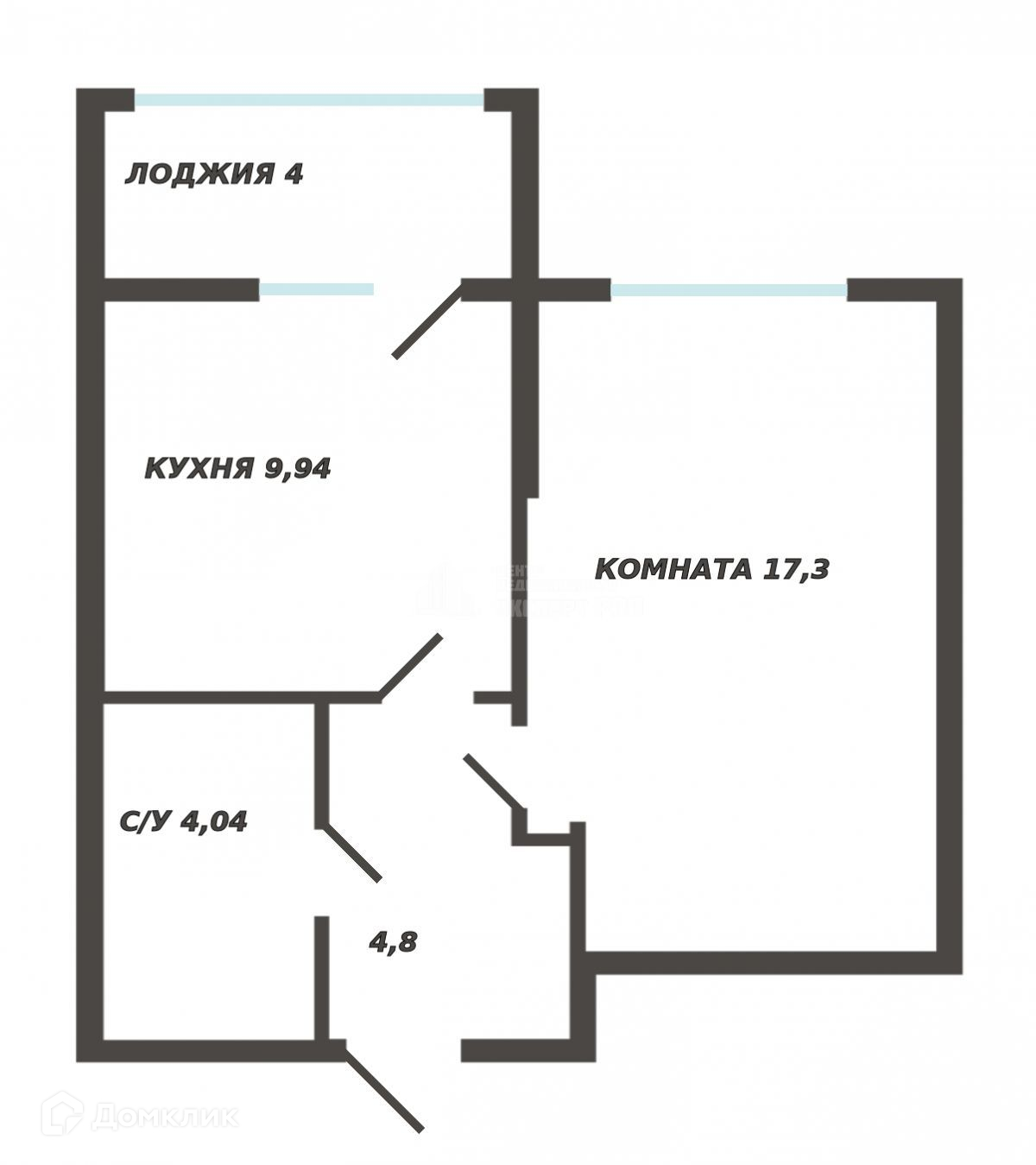 - Площадь комнаты 17,3 м2, кухни 9,94 м2