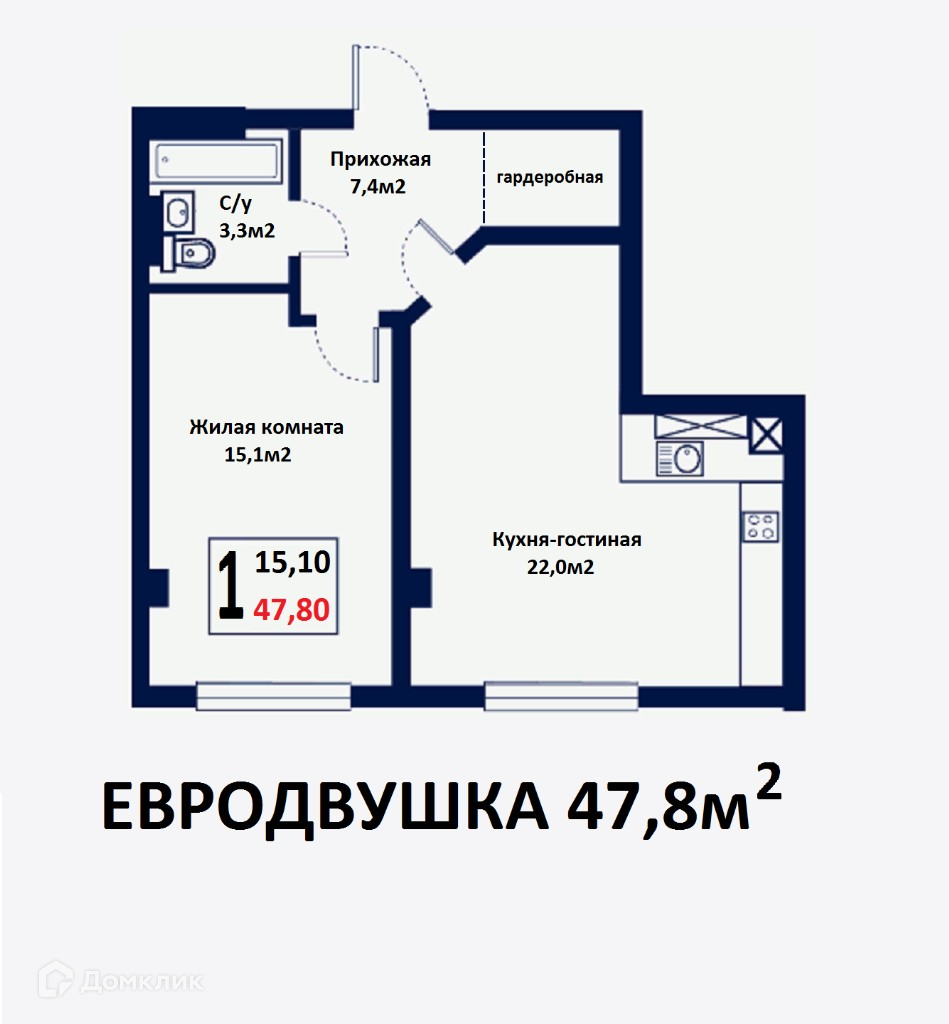 Общая площадь 47.8 м2
