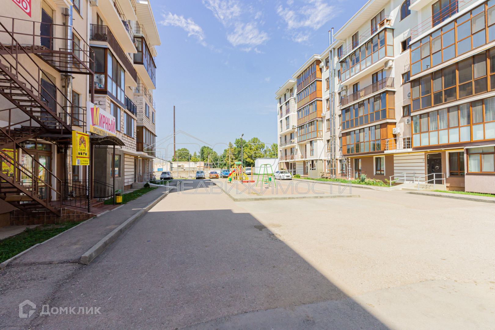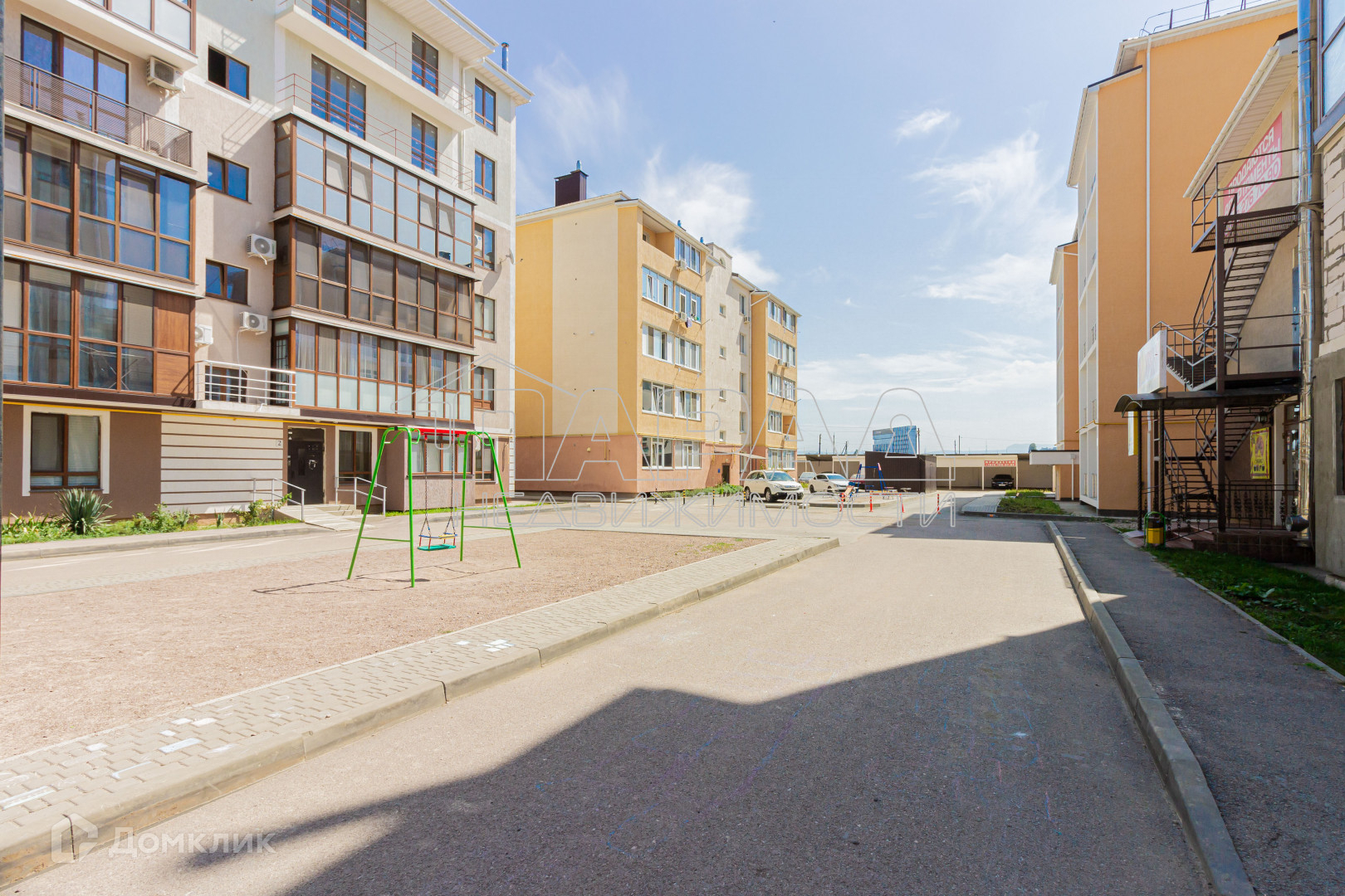 На территории установлена детская площадка с горками и качелями .