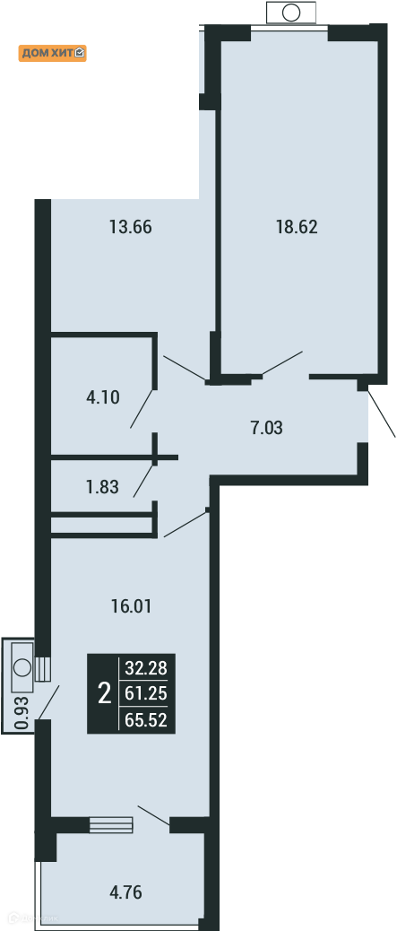 Общая площадь 65.52 м2