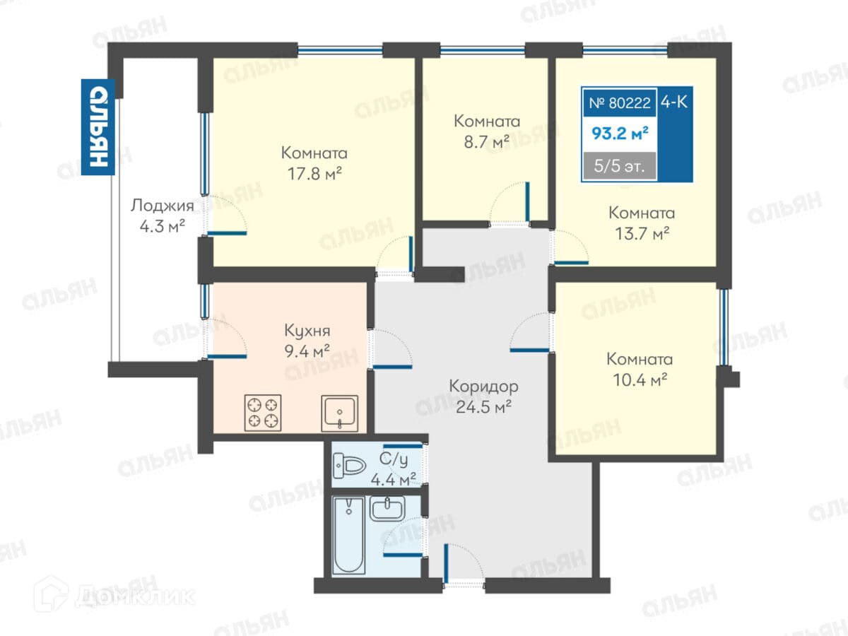 Кухня 9,4 м2, санузел 4,4 м2, коридор 24,5 м2, комната 17,8 м2, комната 8,7 м2, комната 13,7 м2, комната 10,4 м2, лоджия 4,3 м2.