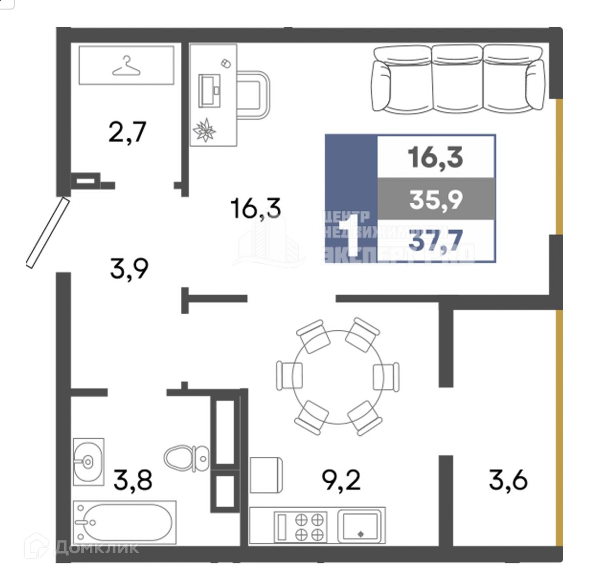 Общая площадь 37.7 м2