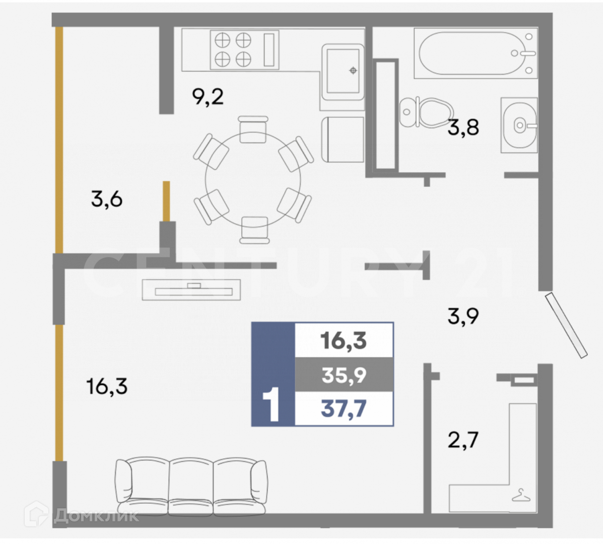 Общая площадь 37.7 м2