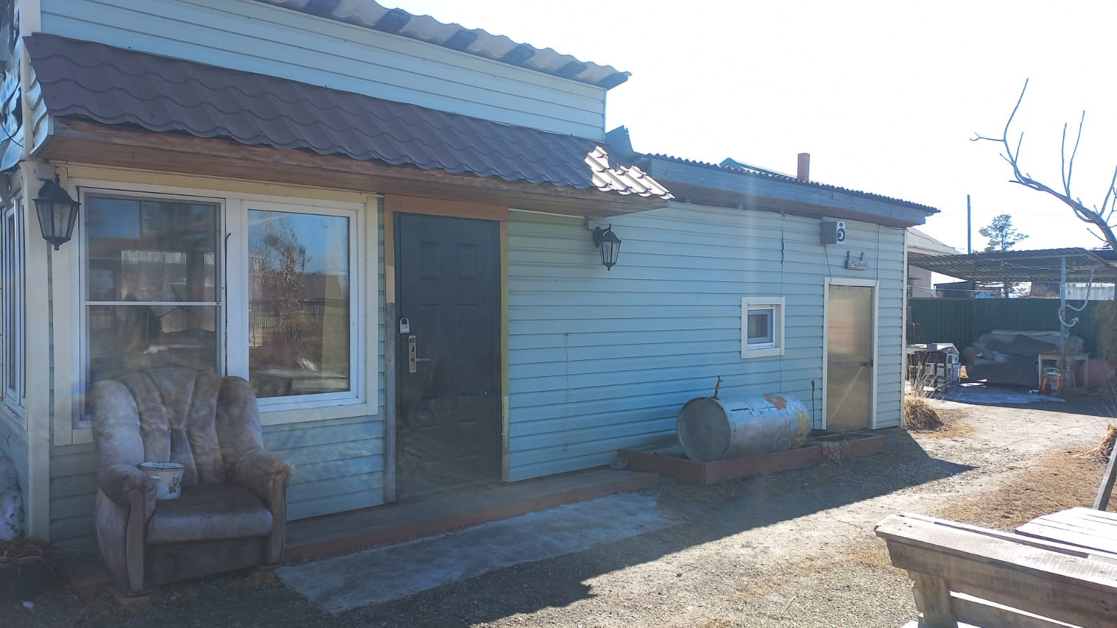 Дом и баня построены из бруса, отделаны сайдингом.