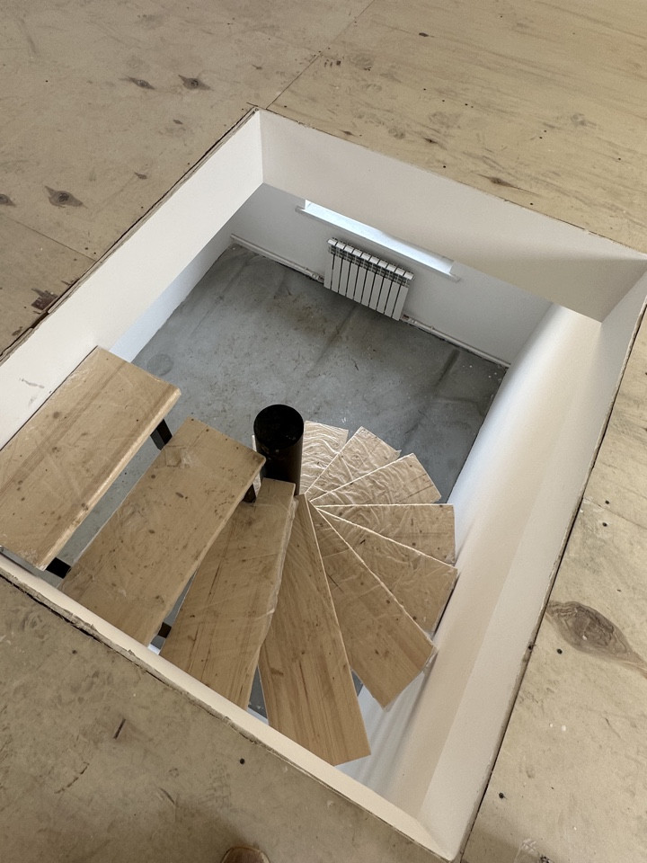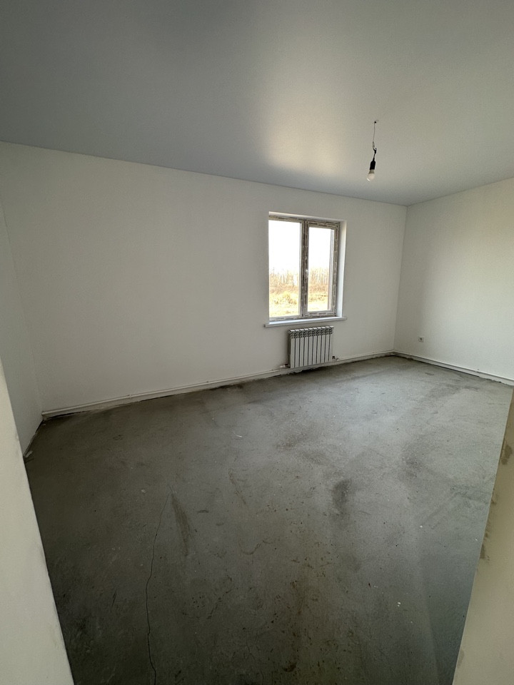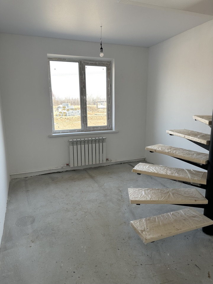 Полы-стяжка, стены выровнены, потолок натяжной, винтовая лестница на второй этаж.