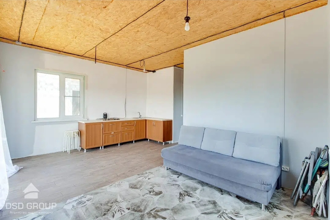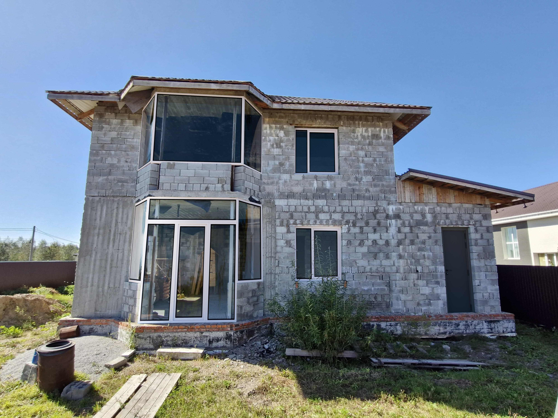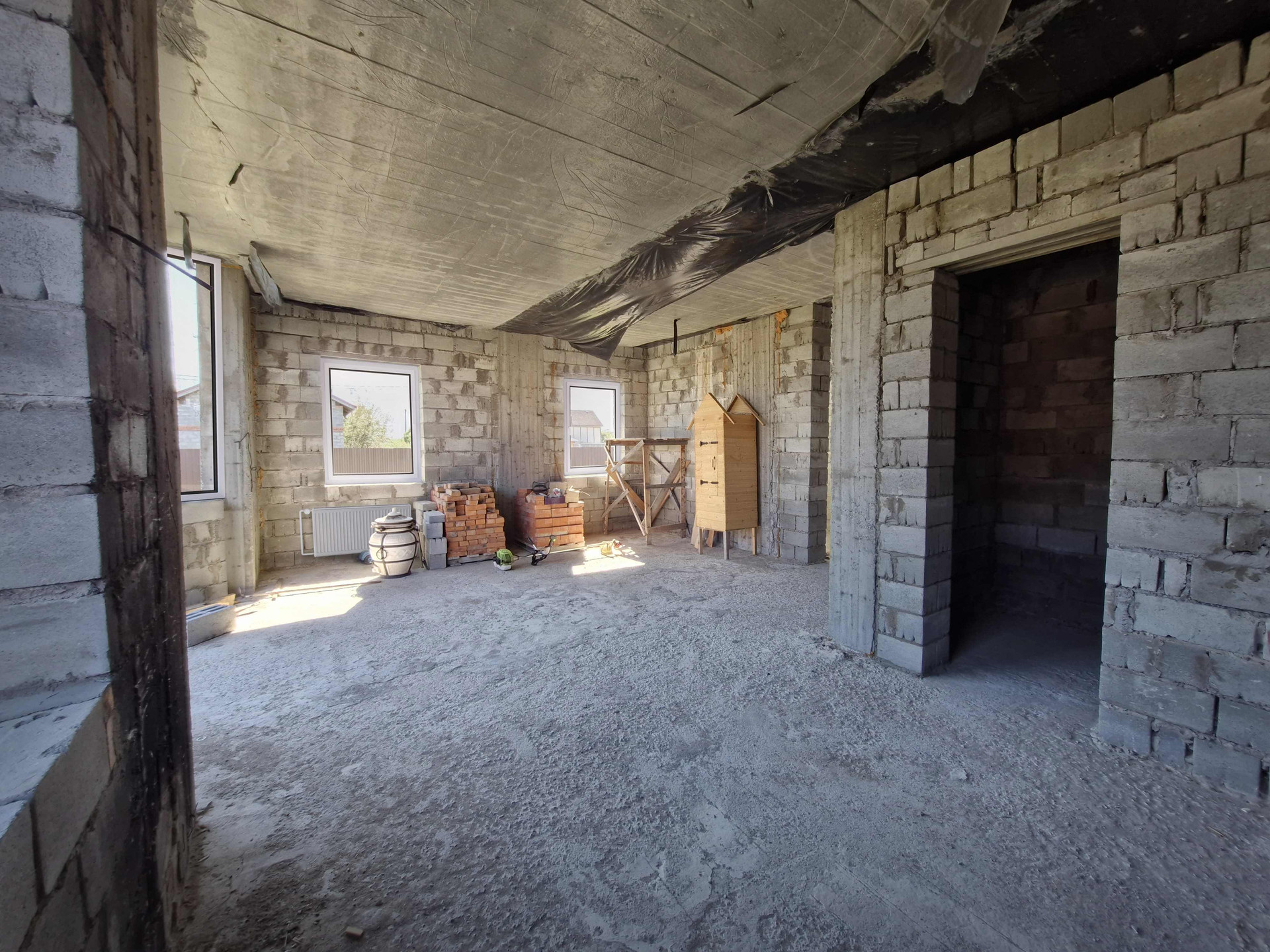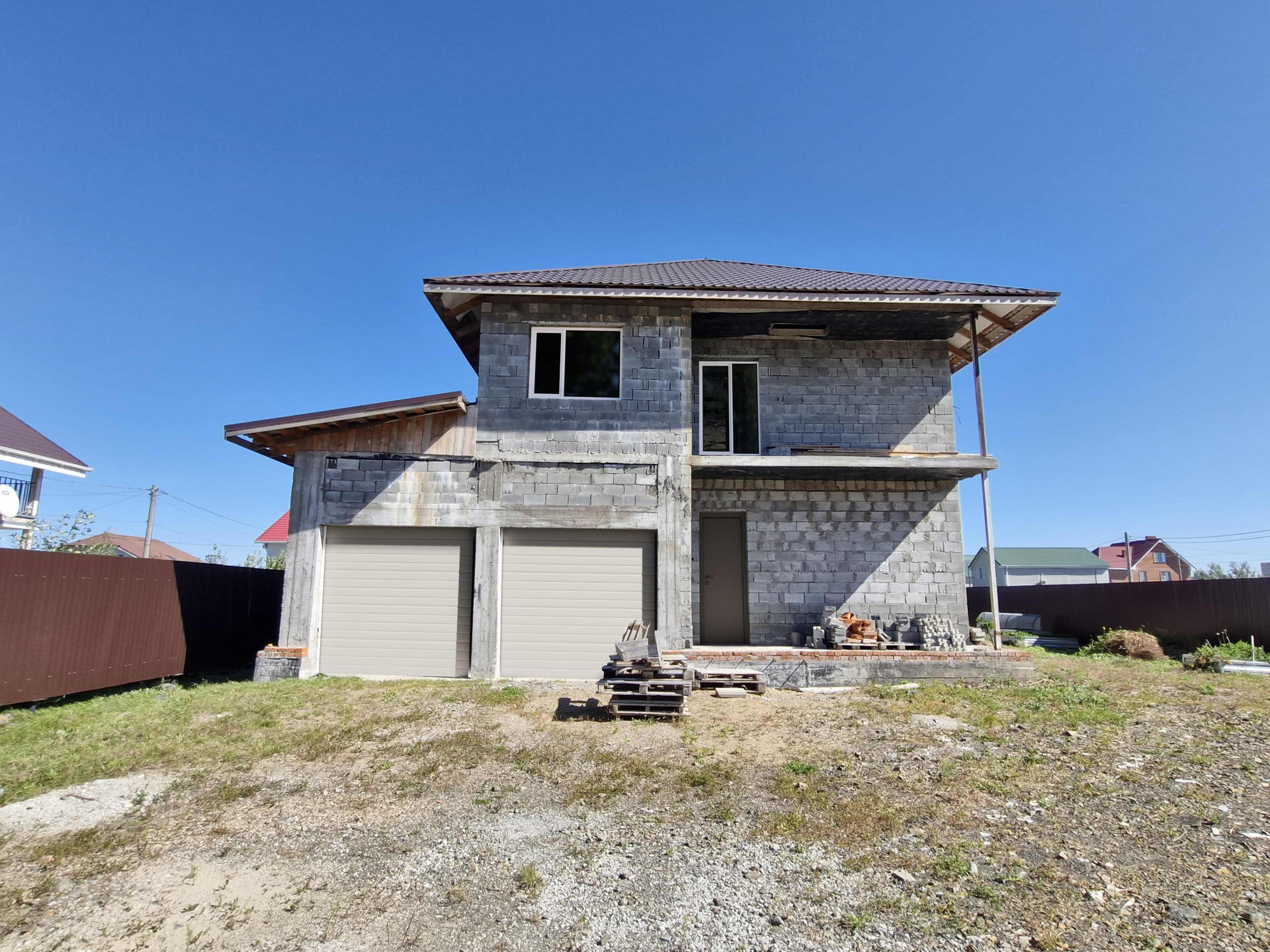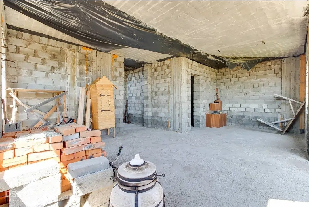 Ленточный фундамент. Стены выполнены из шлакоблоков. 2х этажный с большой просторной гостиной, кухней, спальней, санузлом и тех помещением на первом этаже и двумя детскими комнатами, просторным холлом и вторым санузлом на втором этаже.