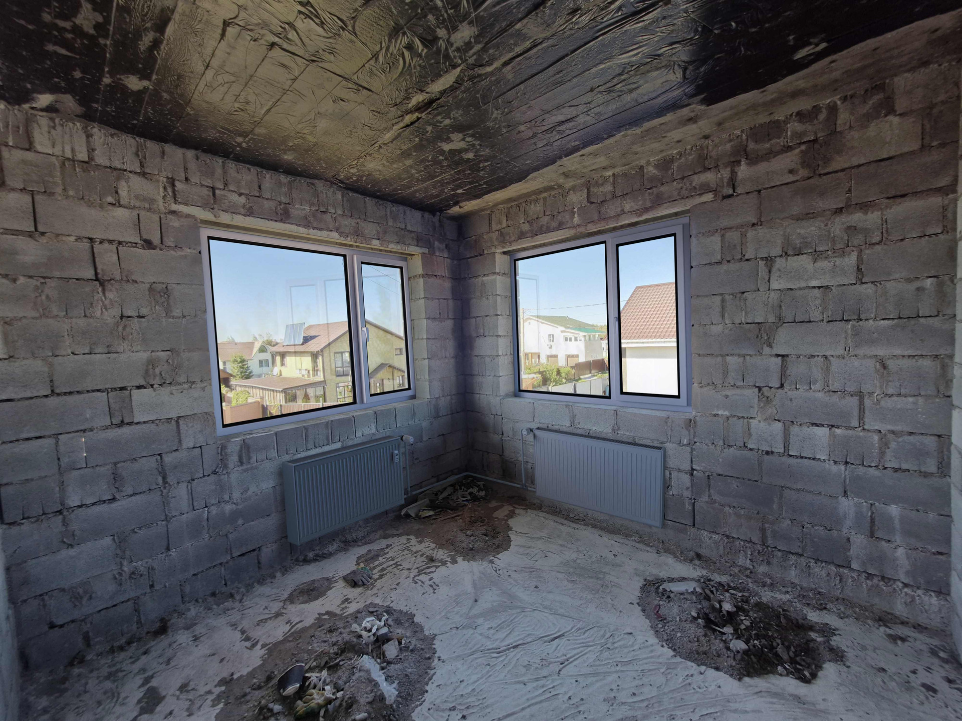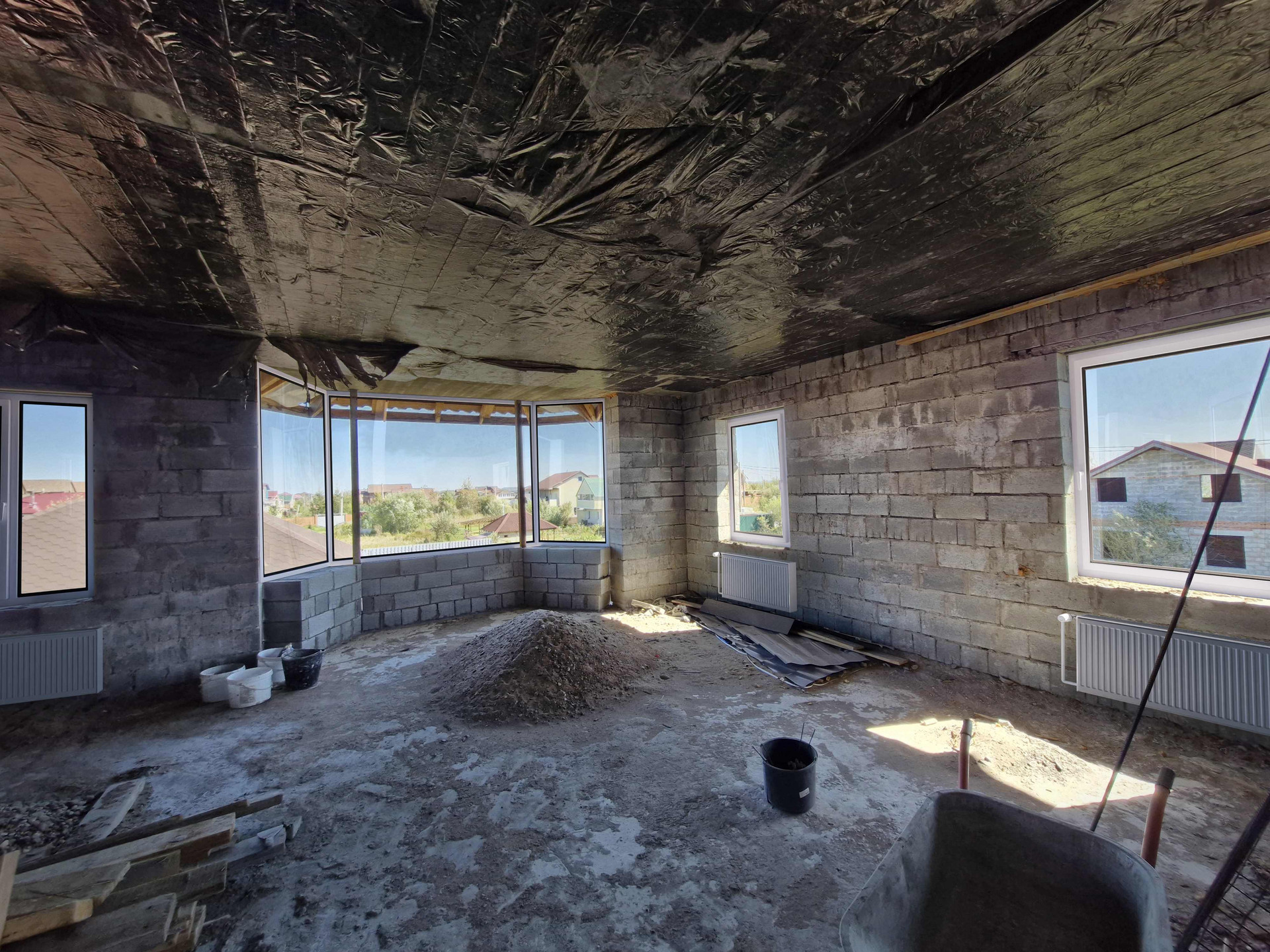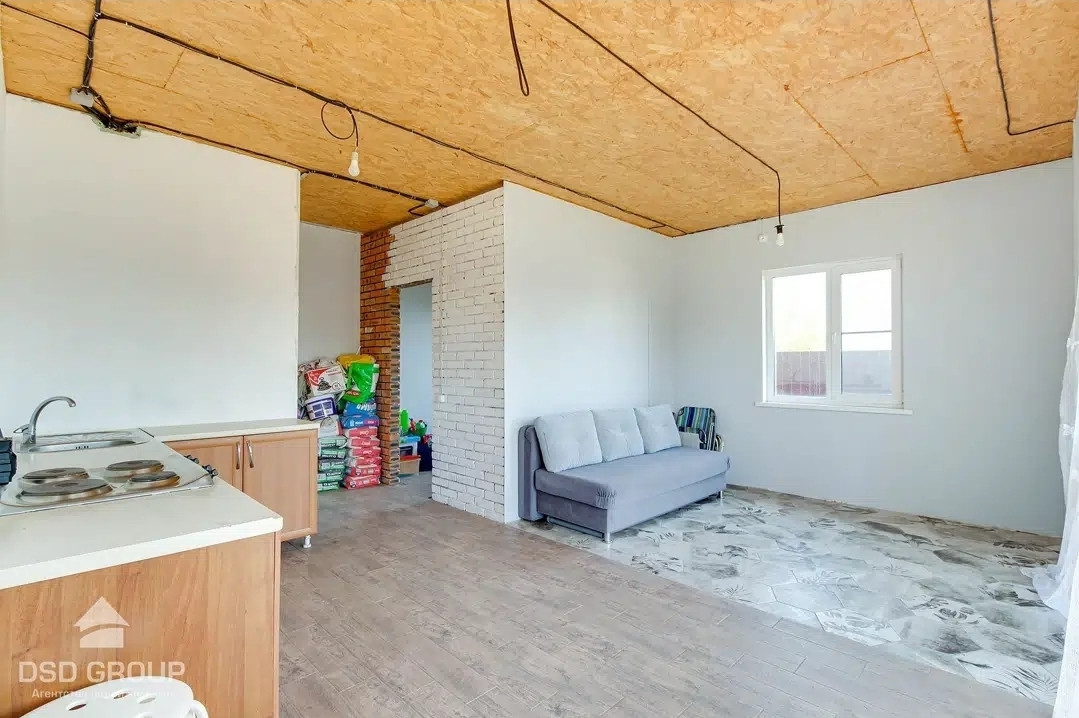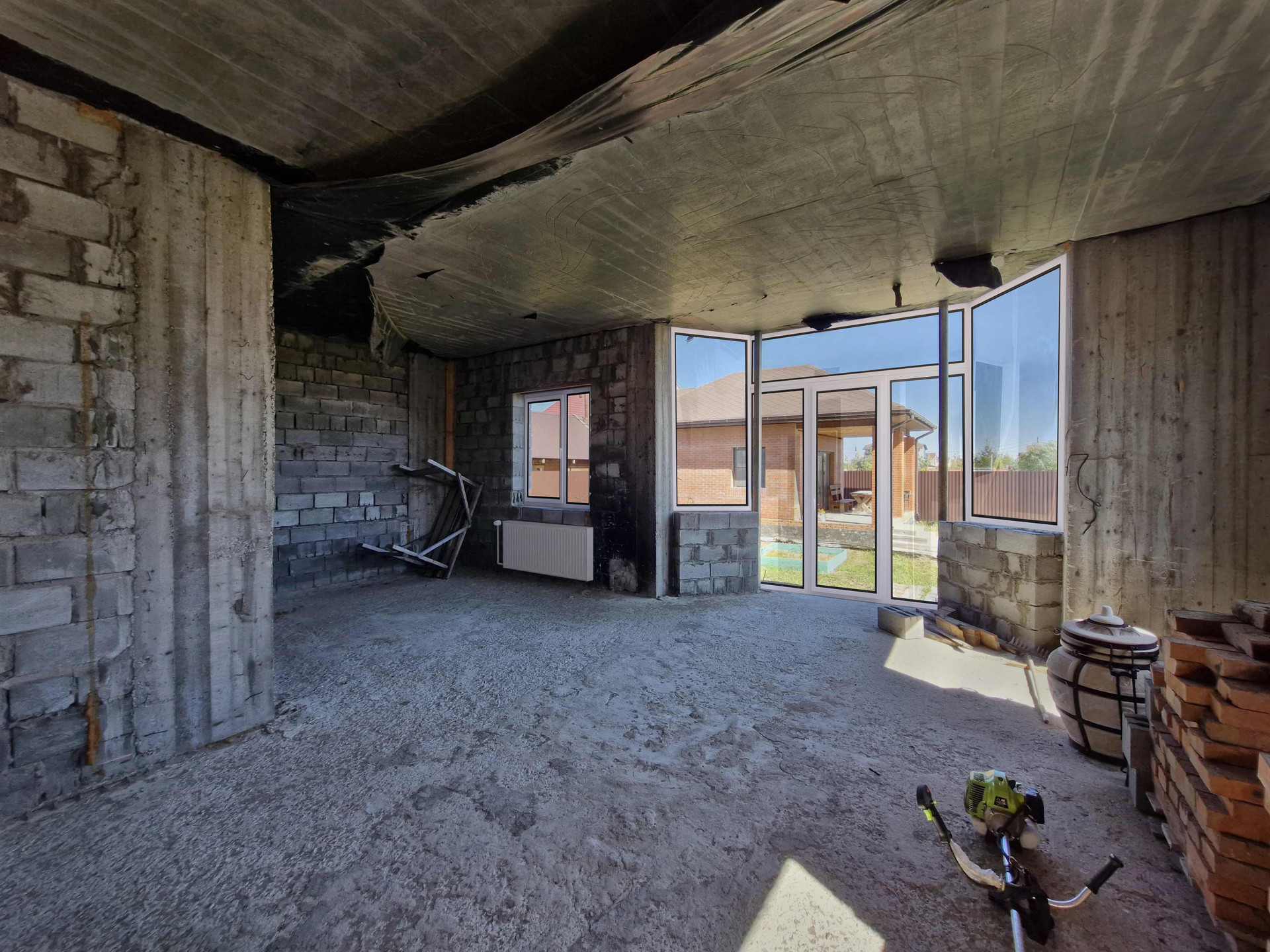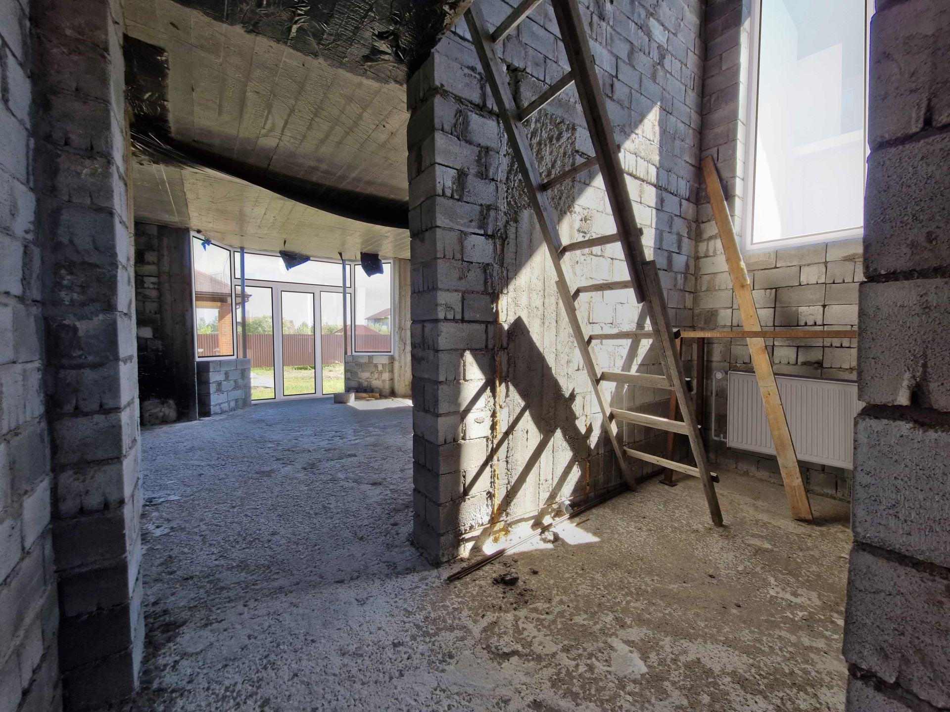 Ленточный фундамент. Стены выполнены из шлакоблоков. 2х этажный с большой просторной гостиной, кухней, спальней, санузлом и тех помещением на первом этаже и двумя детскими комнатами, просторным холлом и вторым санузлом на втором этаже.