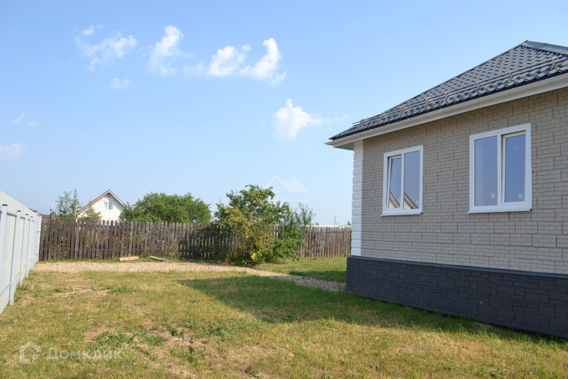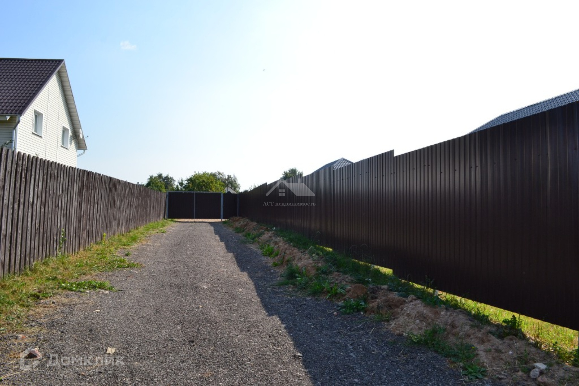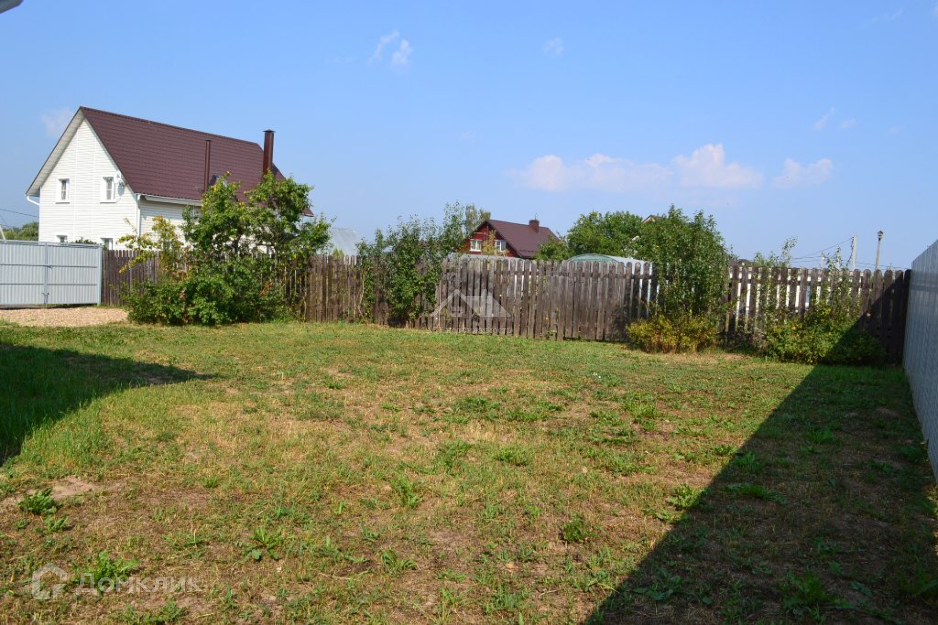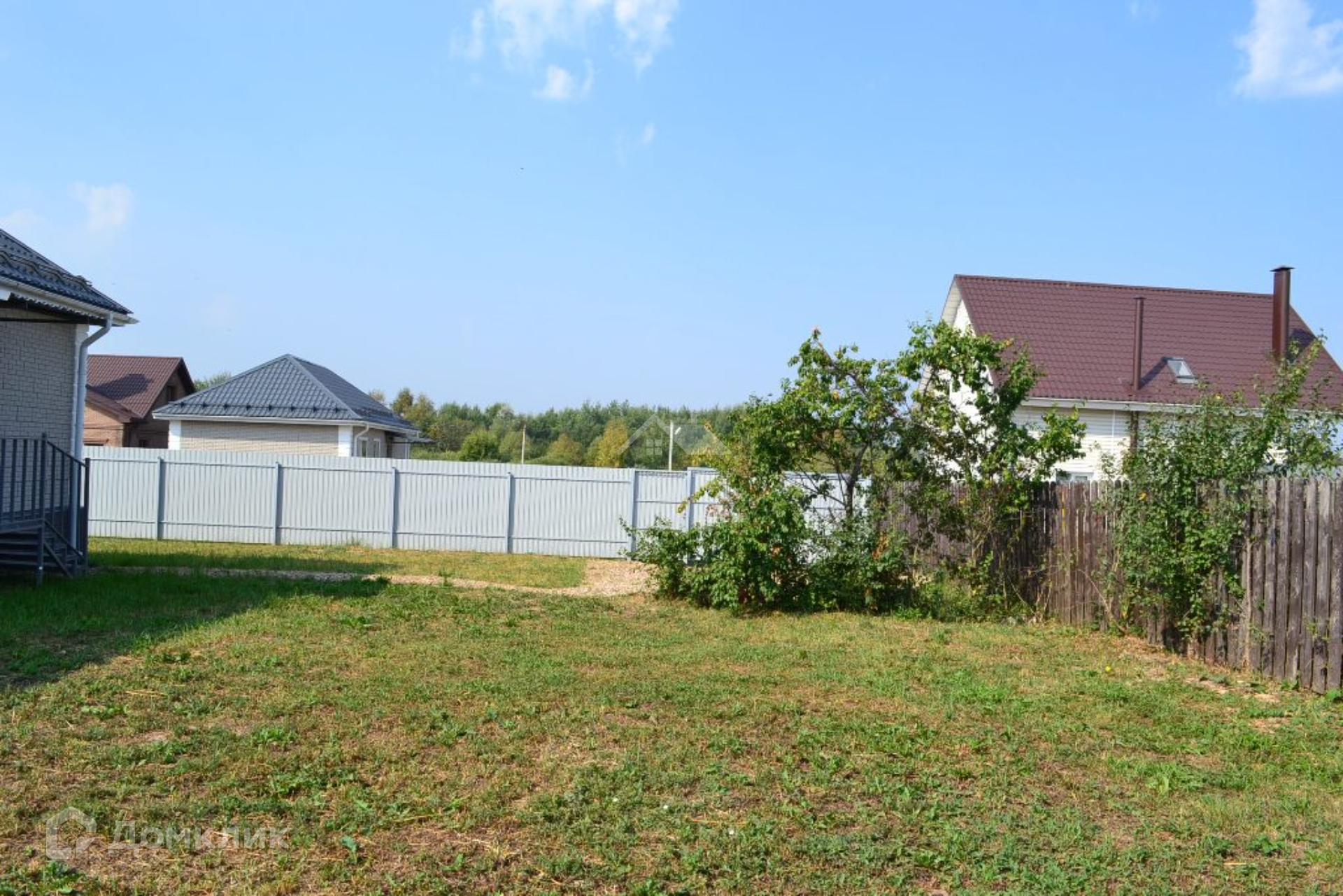 Участок 7,5 соток, по периметру огорожен забором из профнастила на металлическом каркасе с калиткой и распашными воротами. На участке растут плодовые деревья. Площадка для двух автомобилей отсыпана гравием.