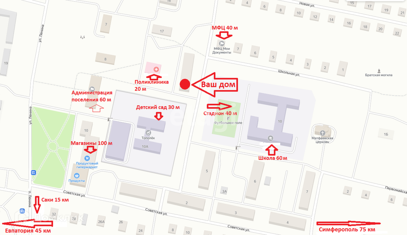 В шаговой доступности находятся магазины, автобусная остановка, администрация поселения, школа, детский сад, МФЦ «Мои документы», поликлиника. До центра г Саки 15 км, до морского побережья 20 км, до Евпатории 45 км, до Симферополя 75 км. Ждём Ваших обращений, готовы незамедлительно организовать личный либо онлайн показ и предоставить исчерпывающую информацию по всем интересующим Вас вопросам.