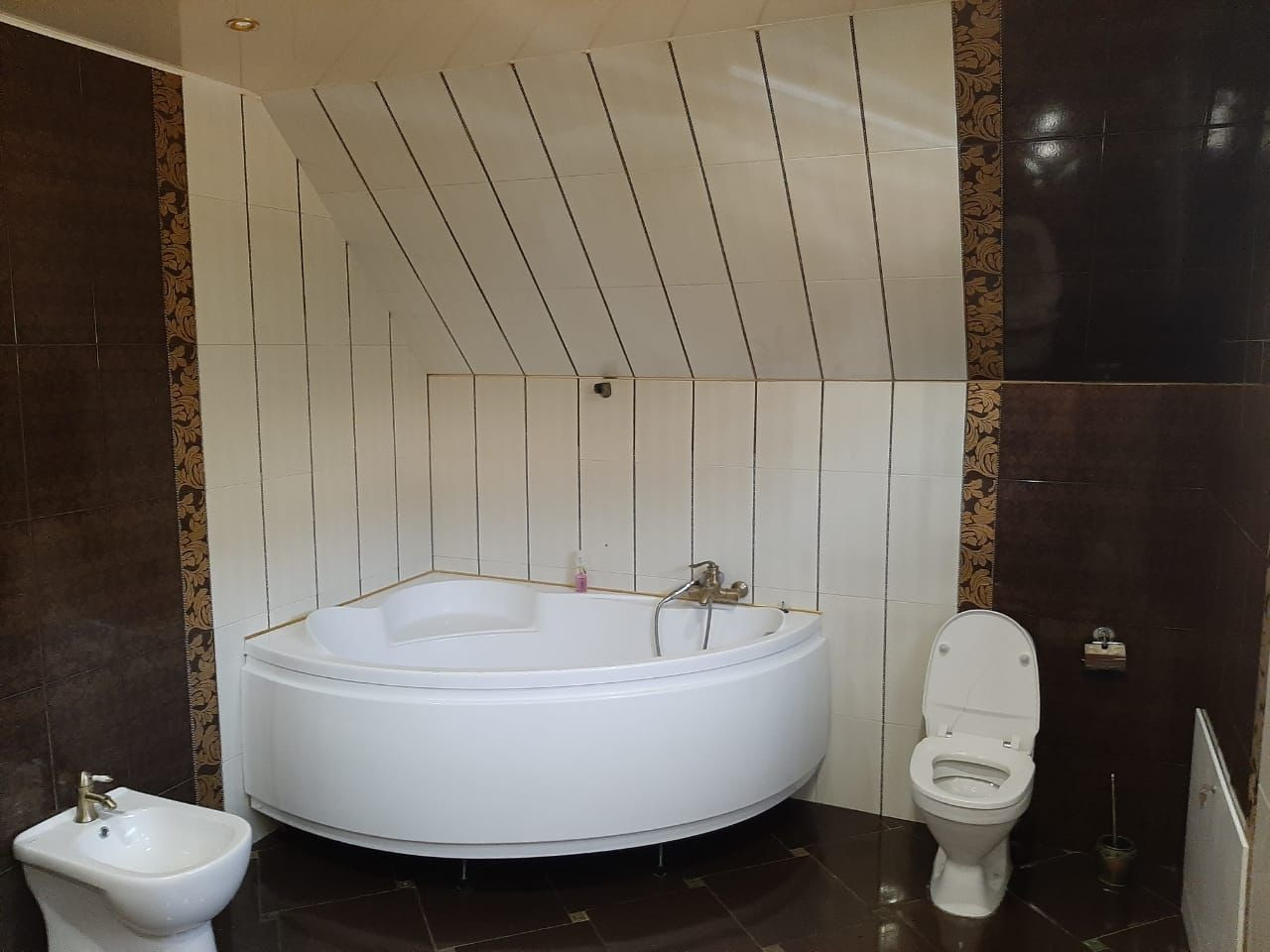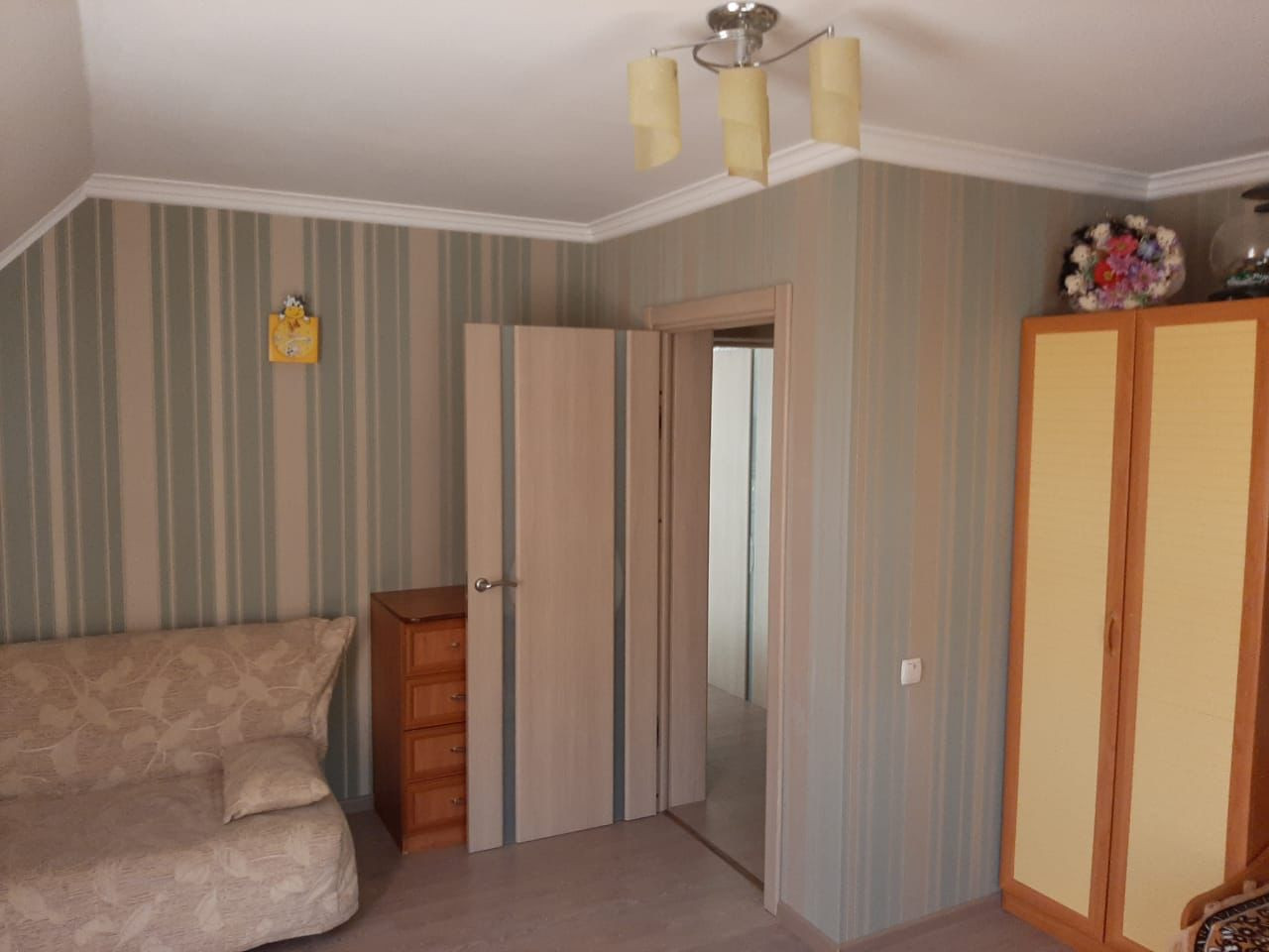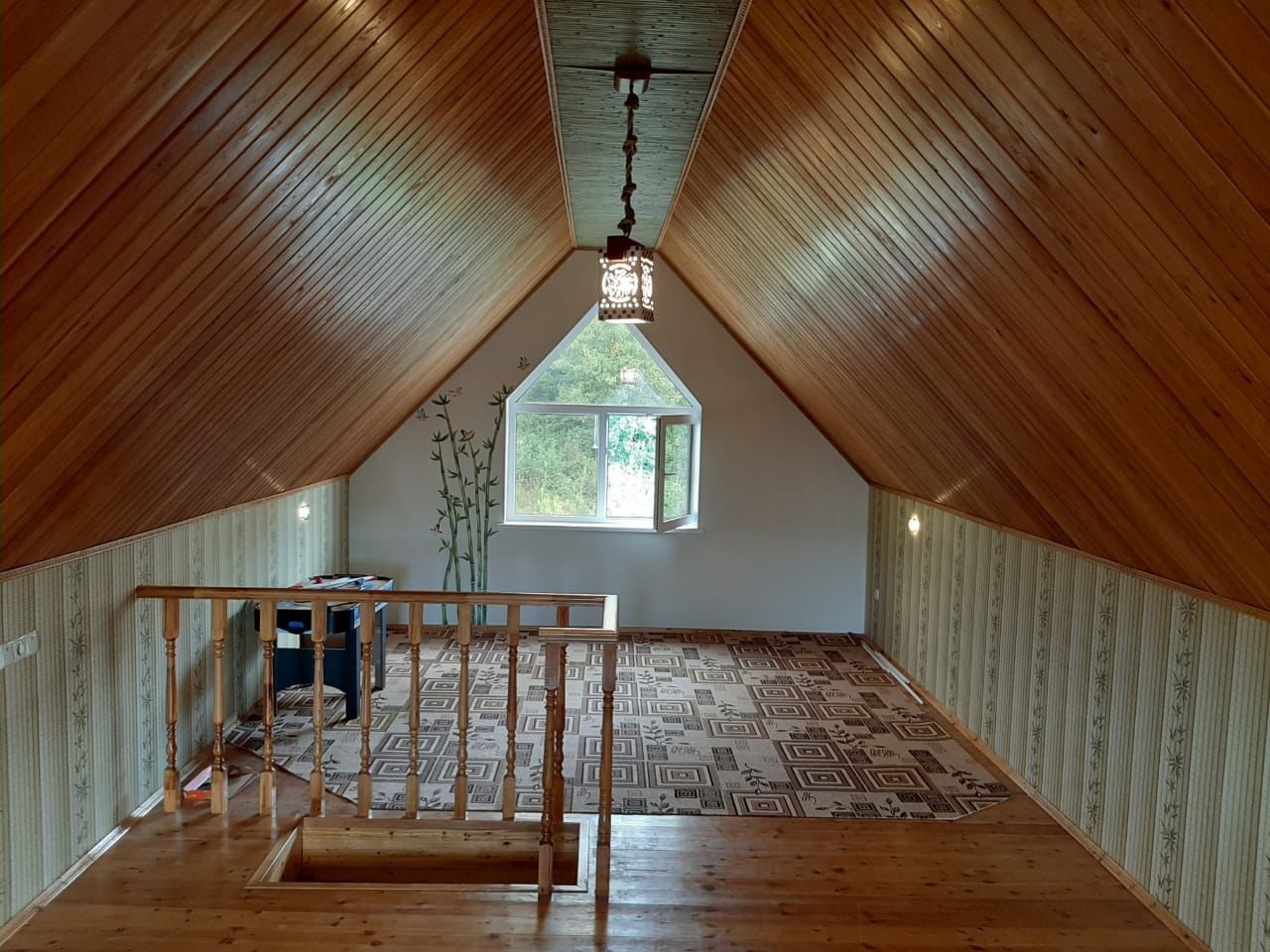 На первом этаже большая кухня гостиная , сан узел с душевой кабиной, и гостевой комнатой.