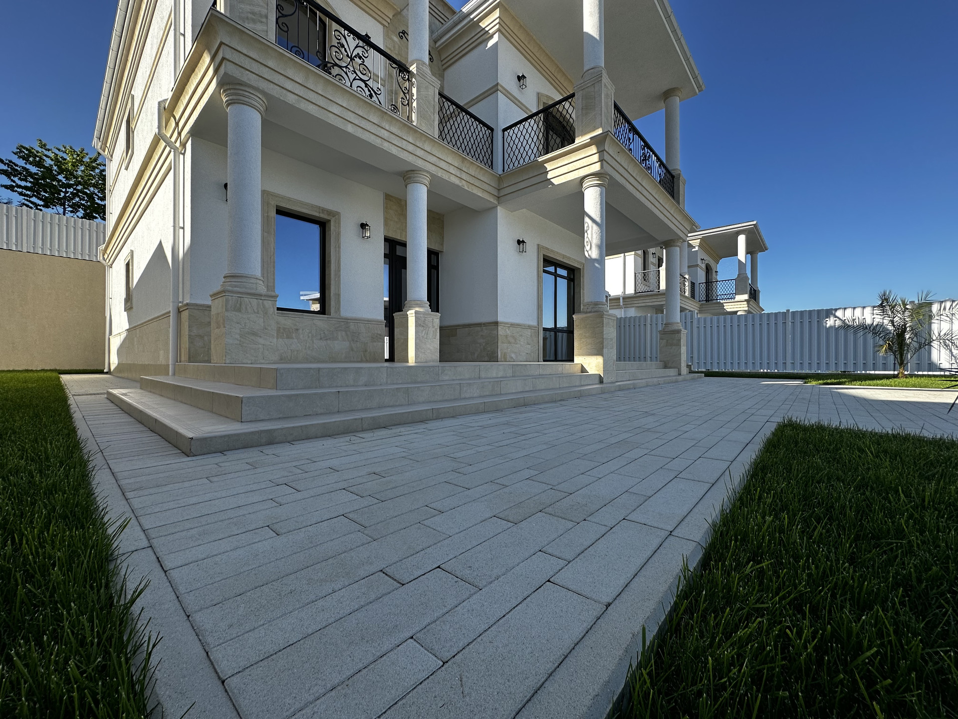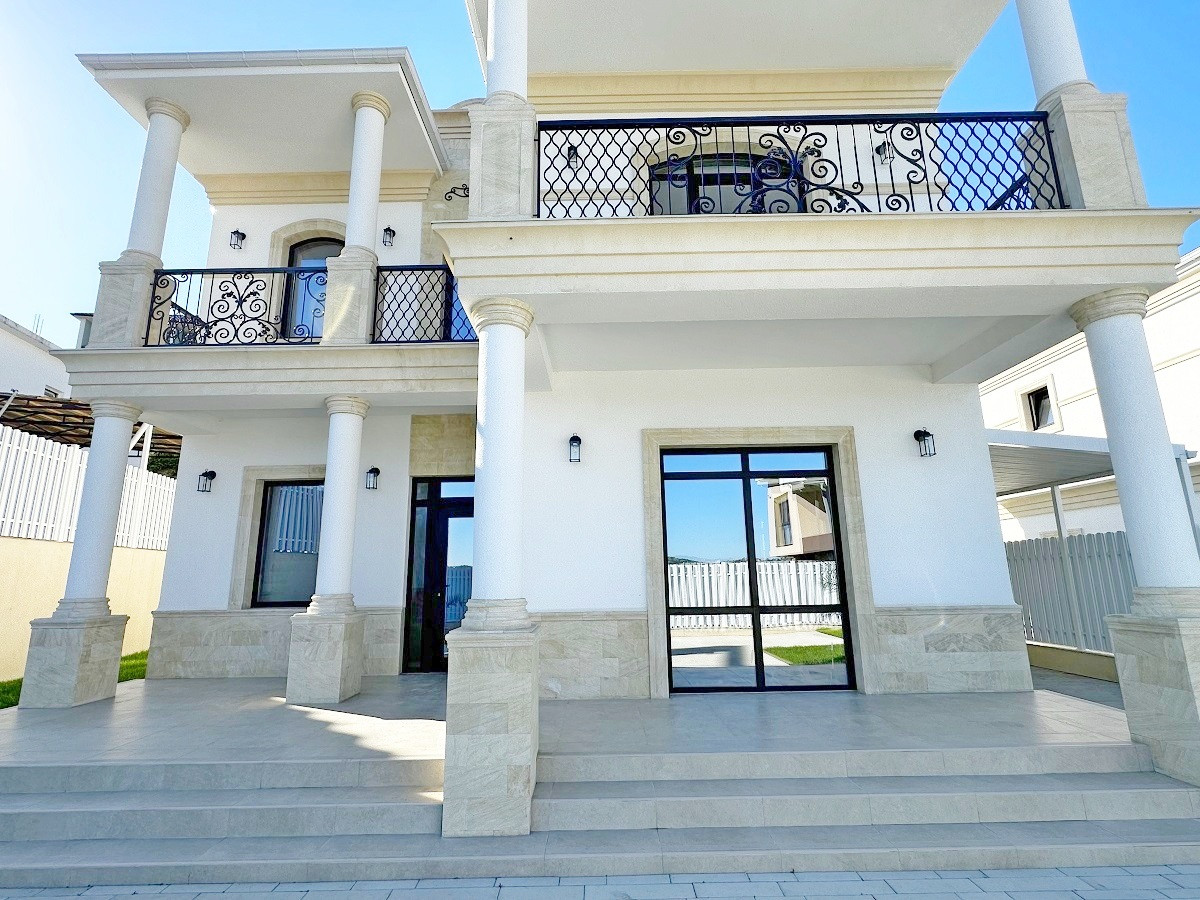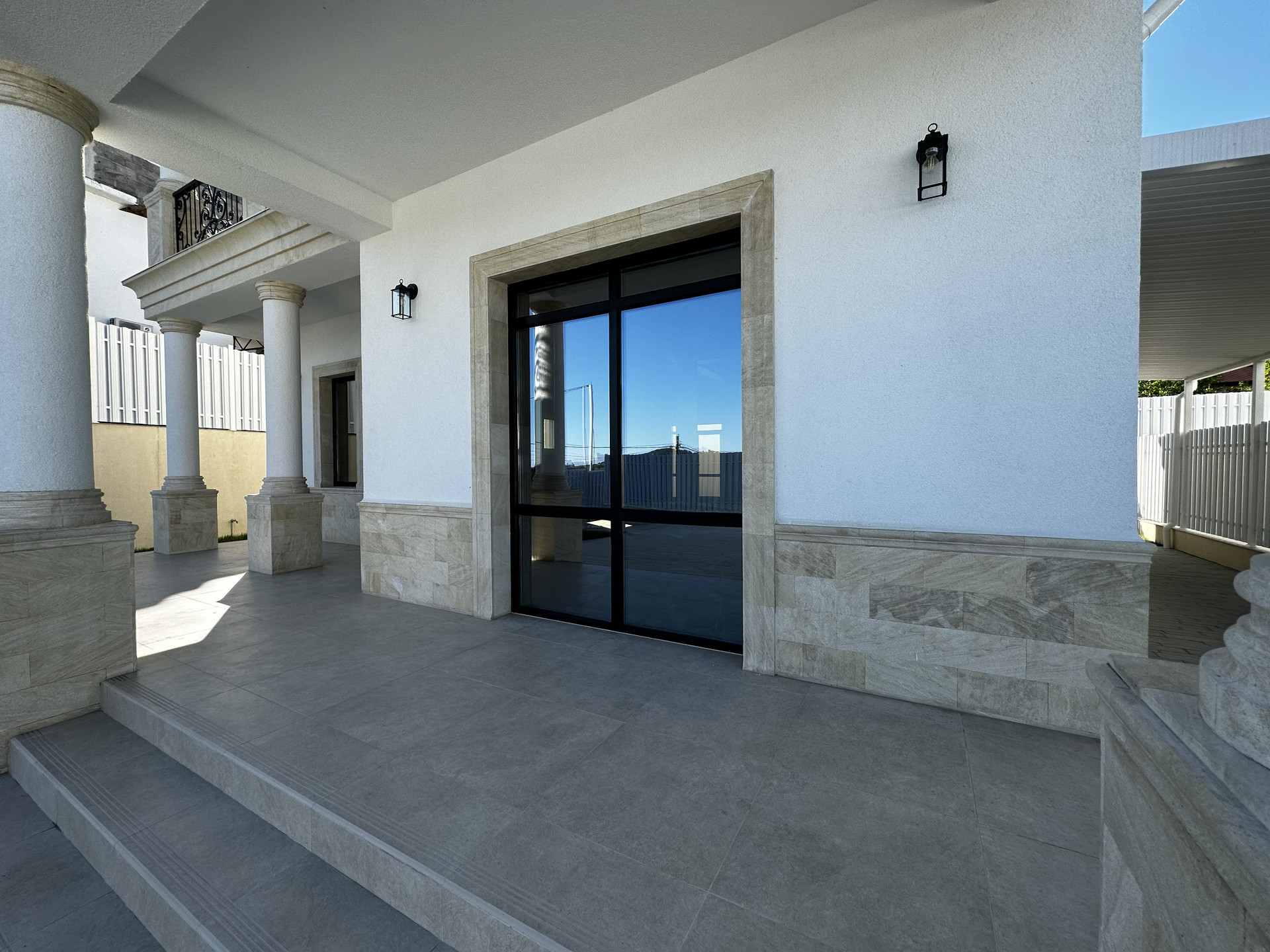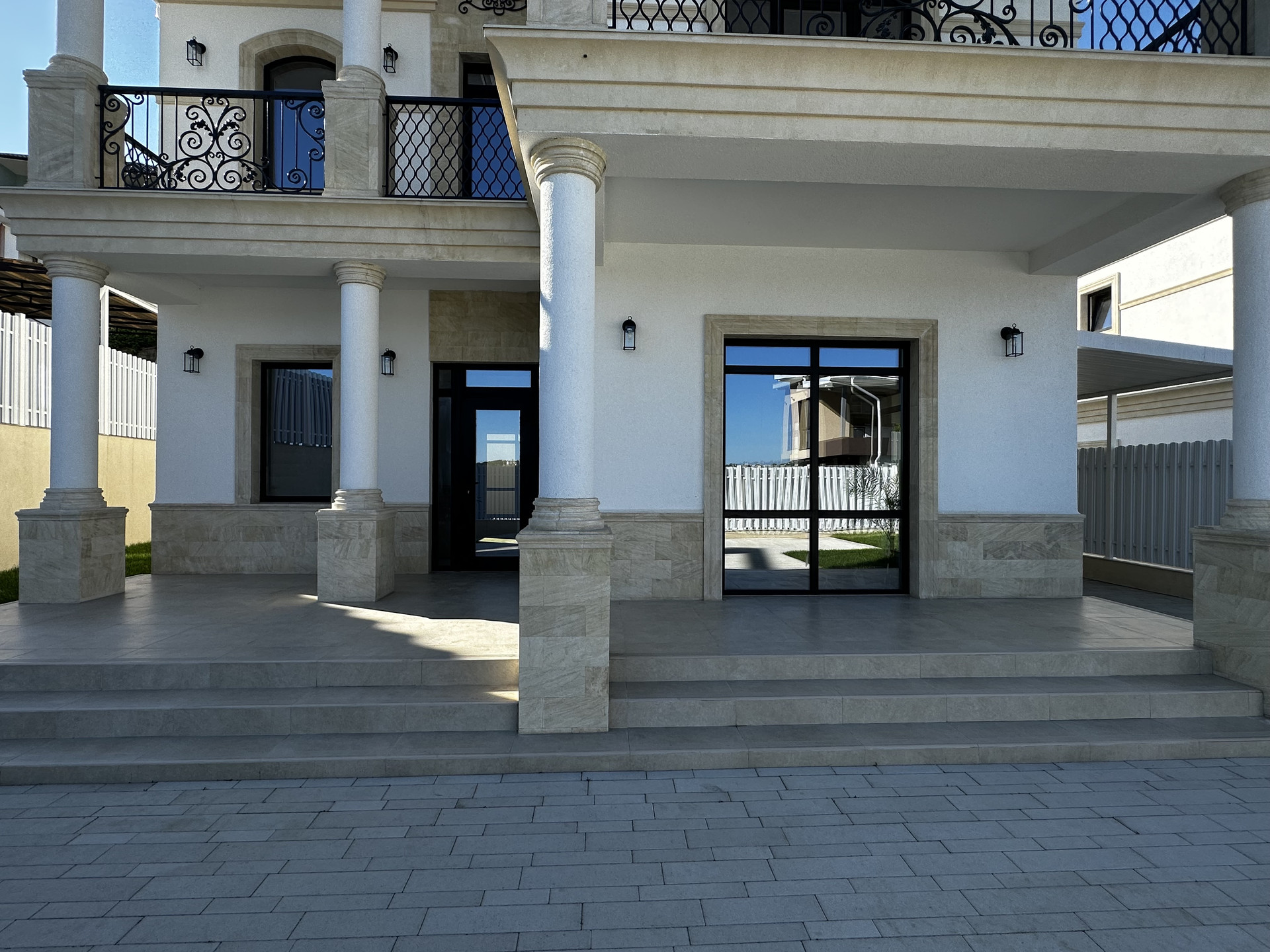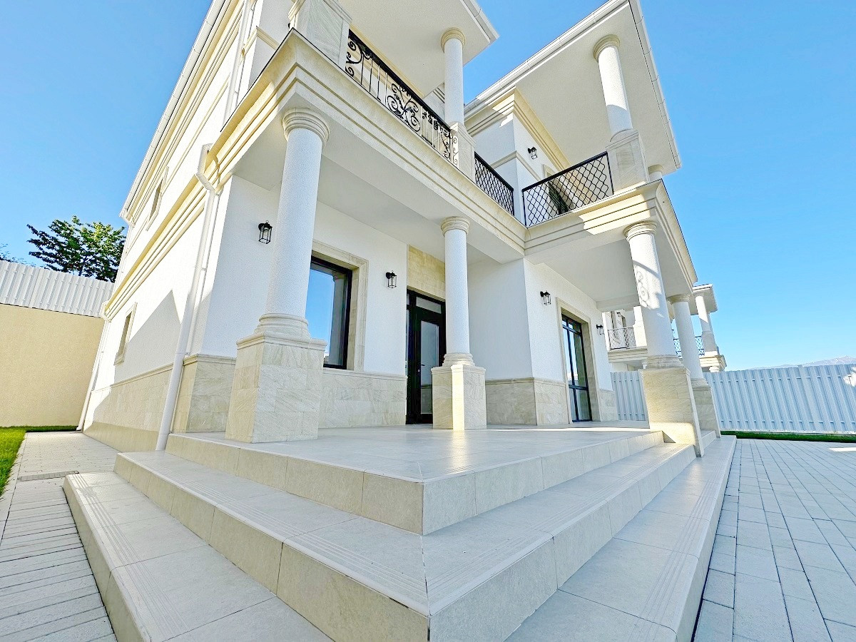 Дом находится в коттеджном поселке и выполнен в классическом стиле.