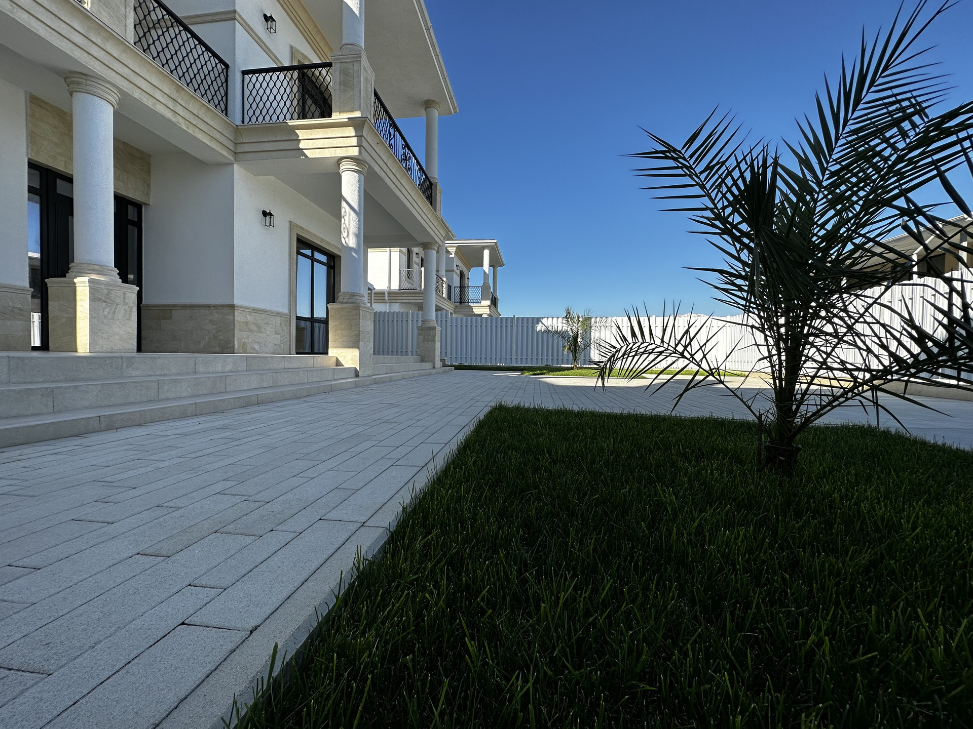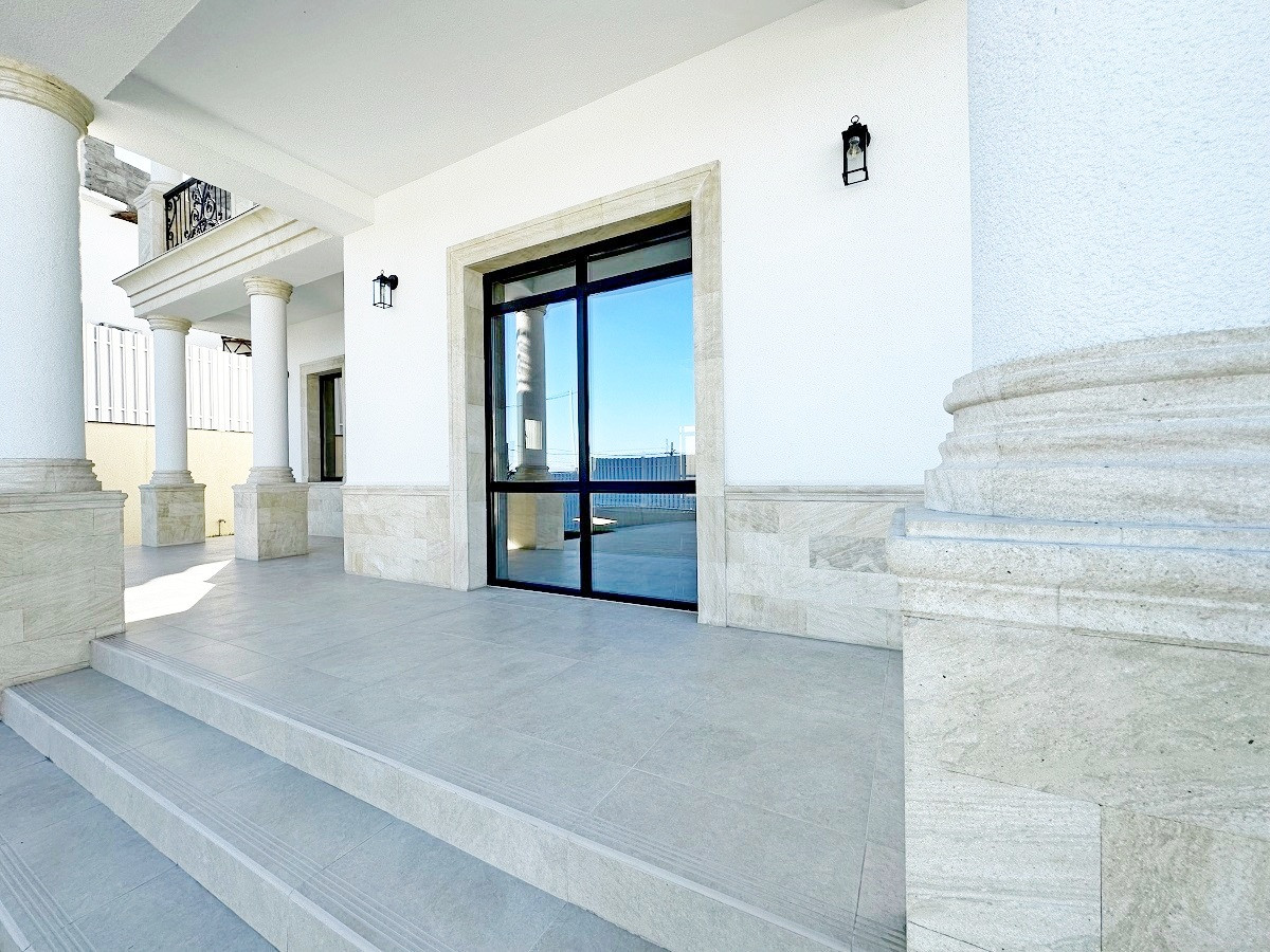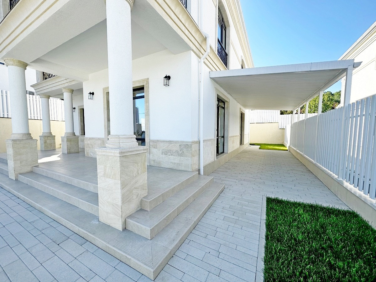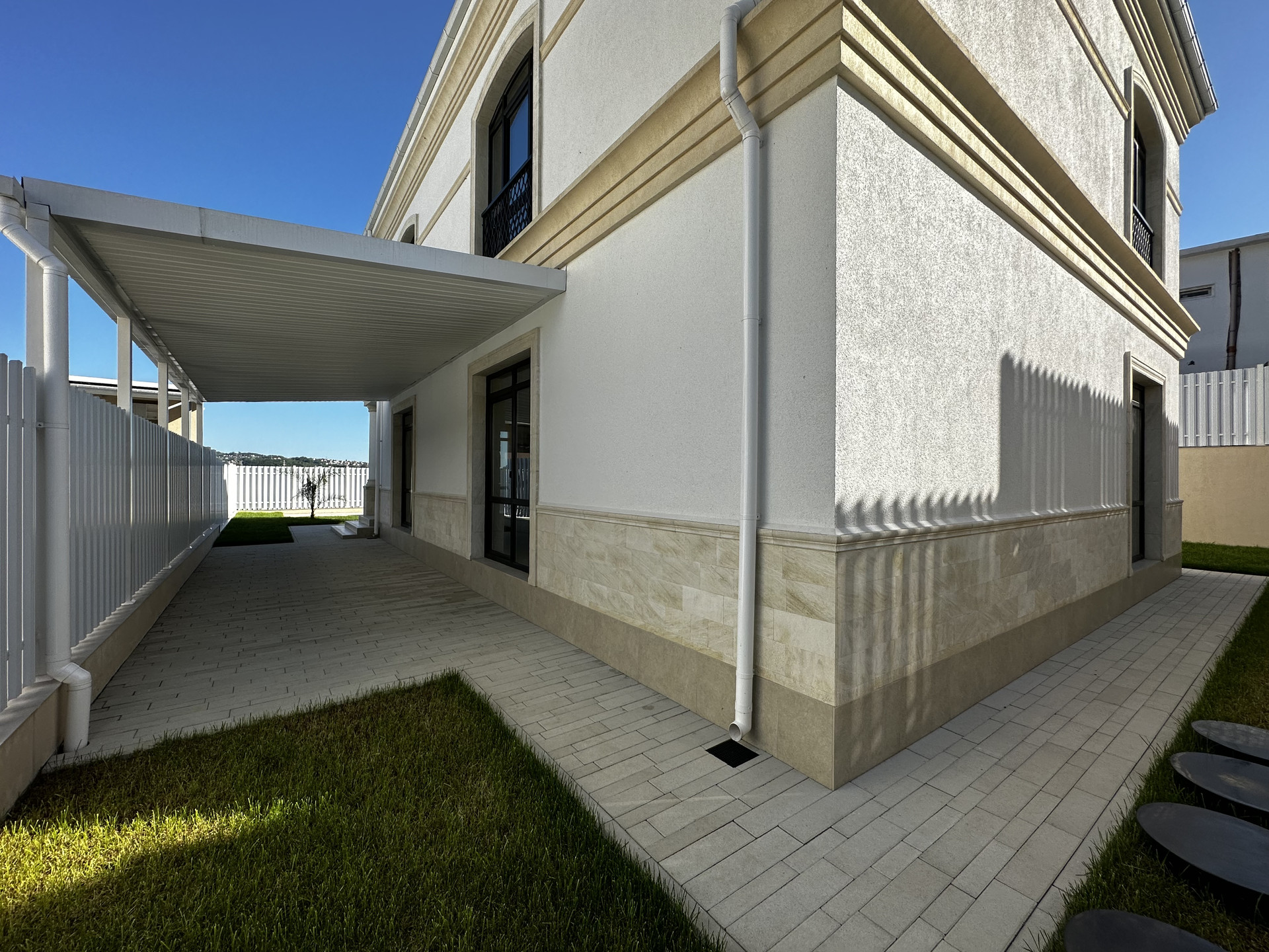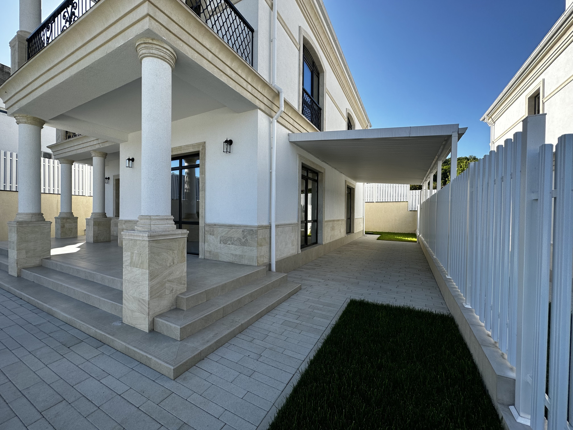 Дом находится в коттеджном поселке и выполнен в классическом стиле.