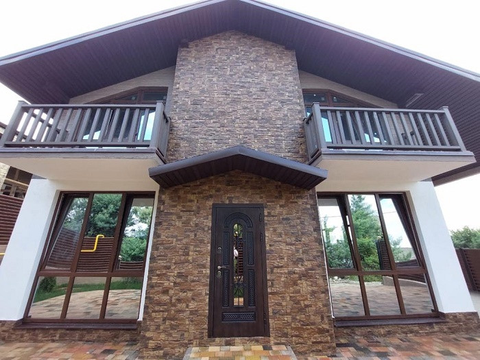 Монолитный каркас с блочным заполнением. Отделка фасада: декоративный камень, короед, дерево.