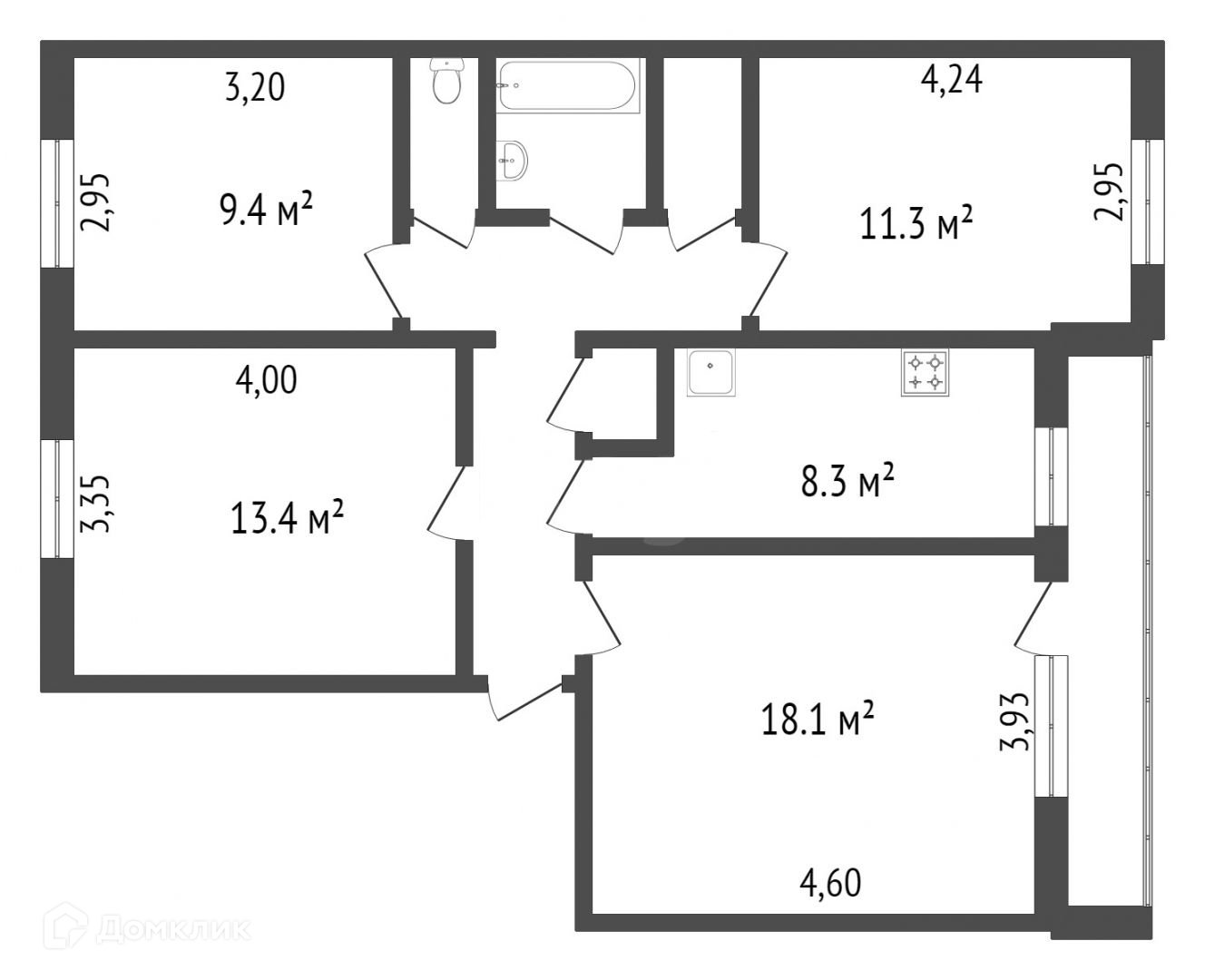 Жилая площадь 52.2 м2