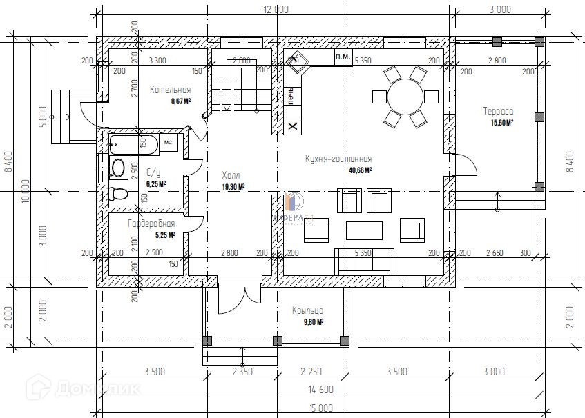 - На первом этаже расположены холл, гардеробная, санузел с окном, котельная с погребом для хранения домашних заготовок и большая кухня-гостиная с выходом на террасу,