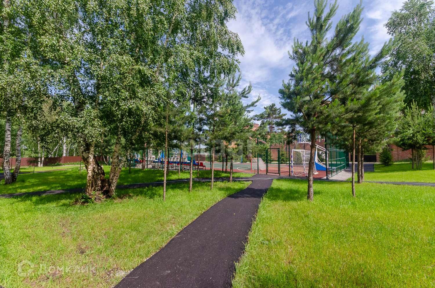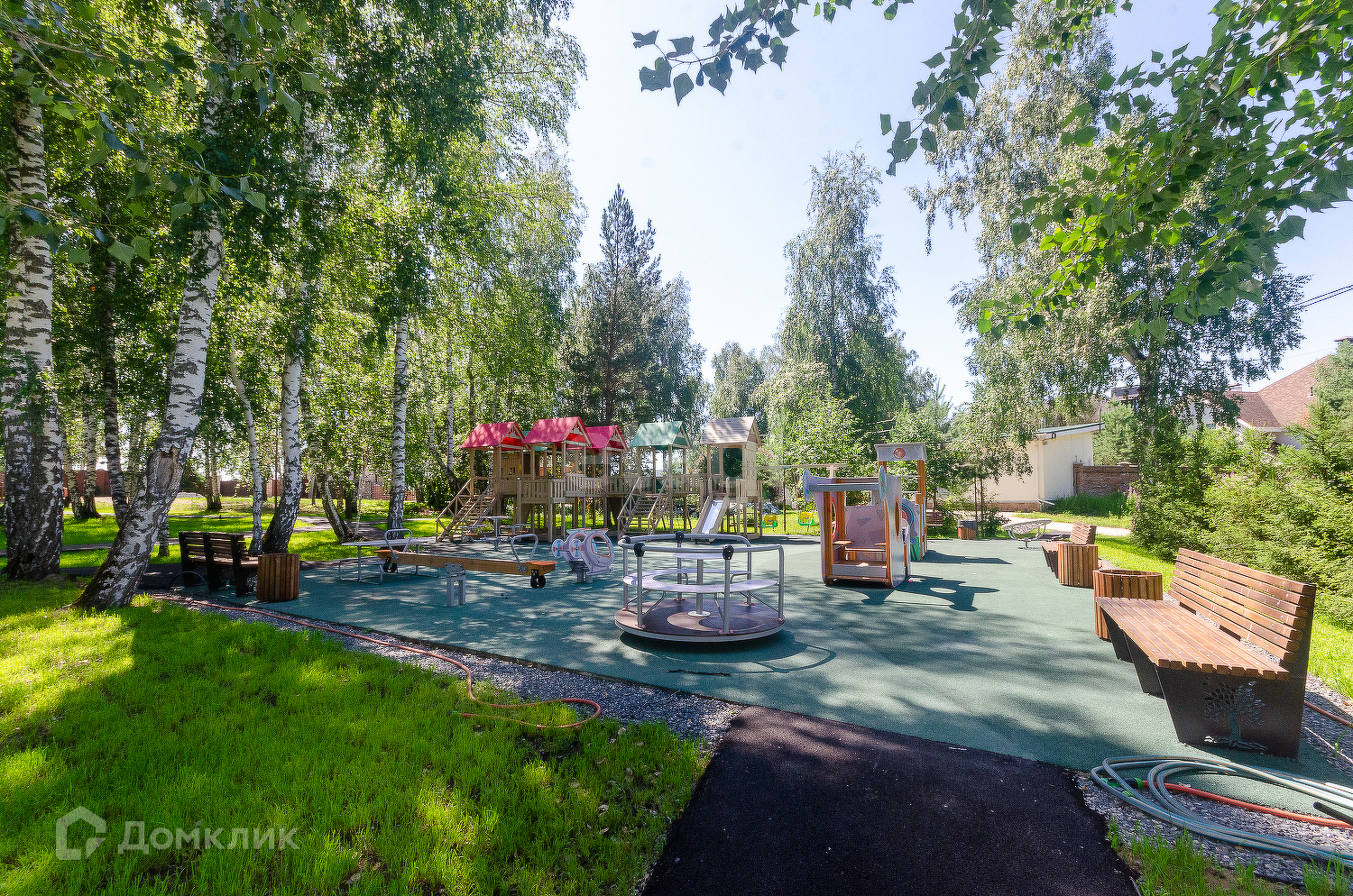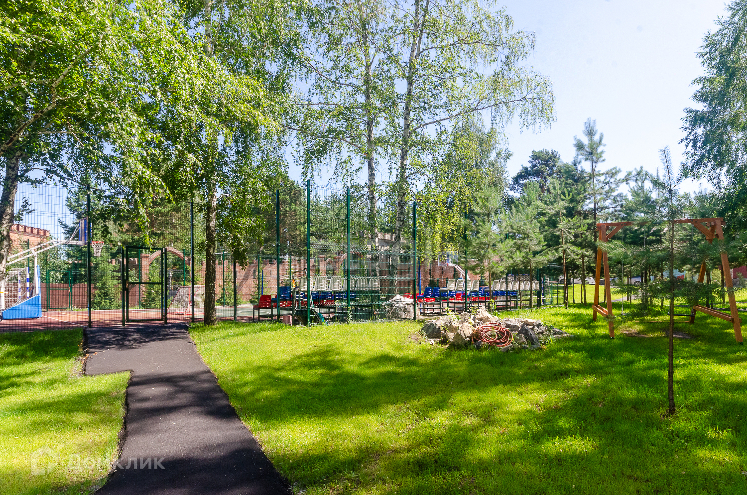 Территория закрытого формата, въезд только по пропускам, в клубе всего 38 участков. На территории клуба согласовано круговое движение. Несмотря на не большое количество участников клуба, территория обустроена собственной детской площадкой и спортивной.