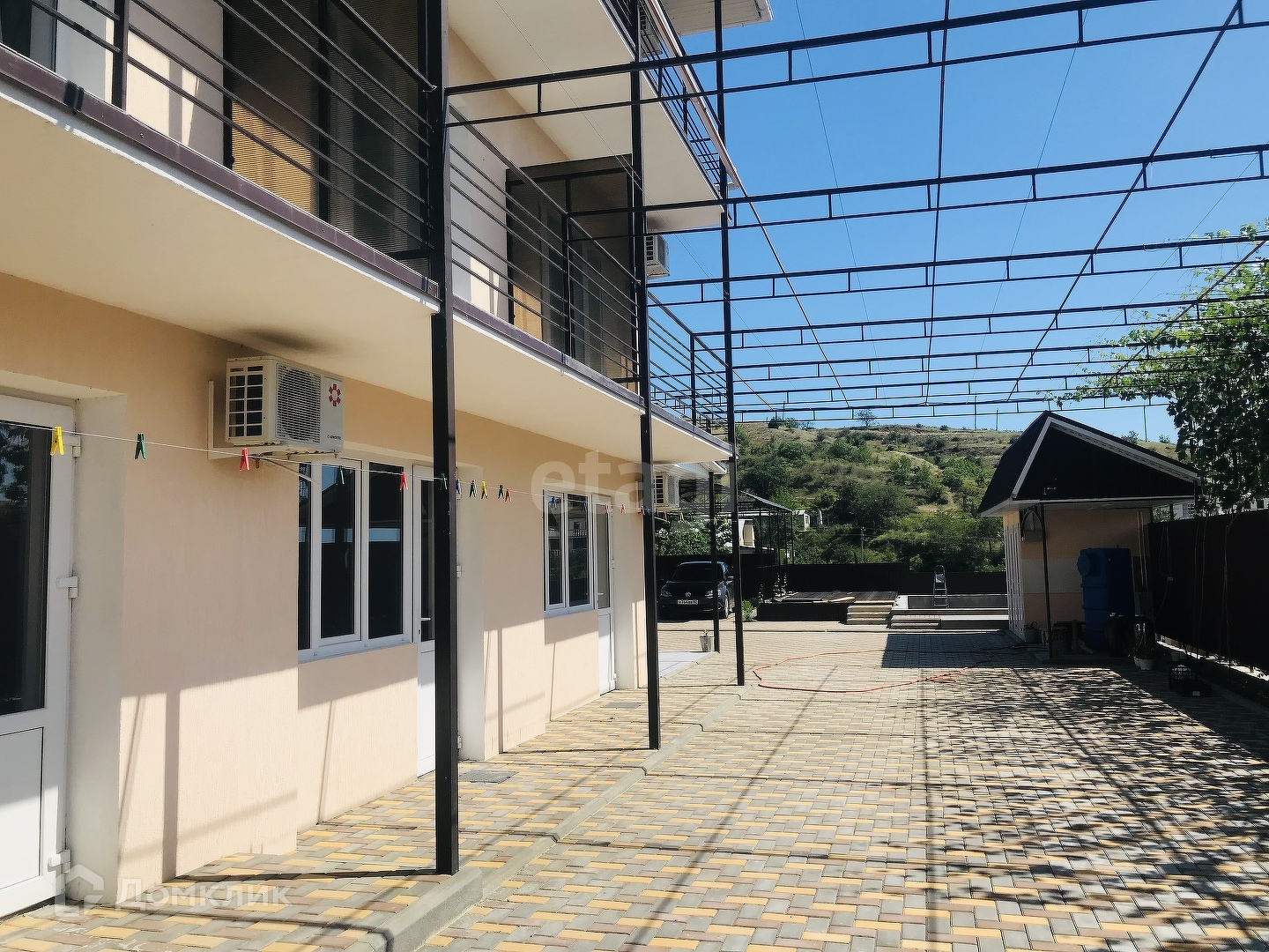 Двор выложен тротуарной плиткой, великолепно озеленен: растут розы, туи, виноград, гранат.
