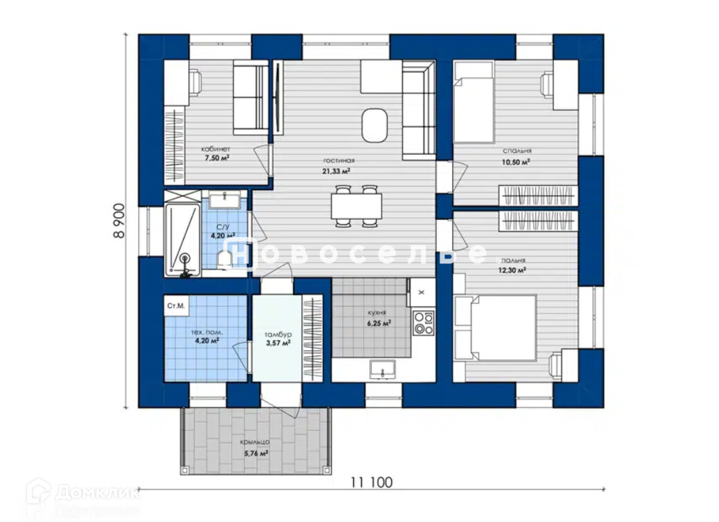 ----Проект под постройку!----Холл - 3 м2Кухня - 6.3 м2Гостинная - 21 м2Спальня 1 - 10.5 м2Санузел - 4.2 м2Спальня 2 -12 м2Общая площадь - 76 м2- Ленточный, монолитный, железобетонный фундамент, стеновые материалы, фасад и кровля - на выбор! Окна ПВХ, внутренняя отделка WhiteBox.
