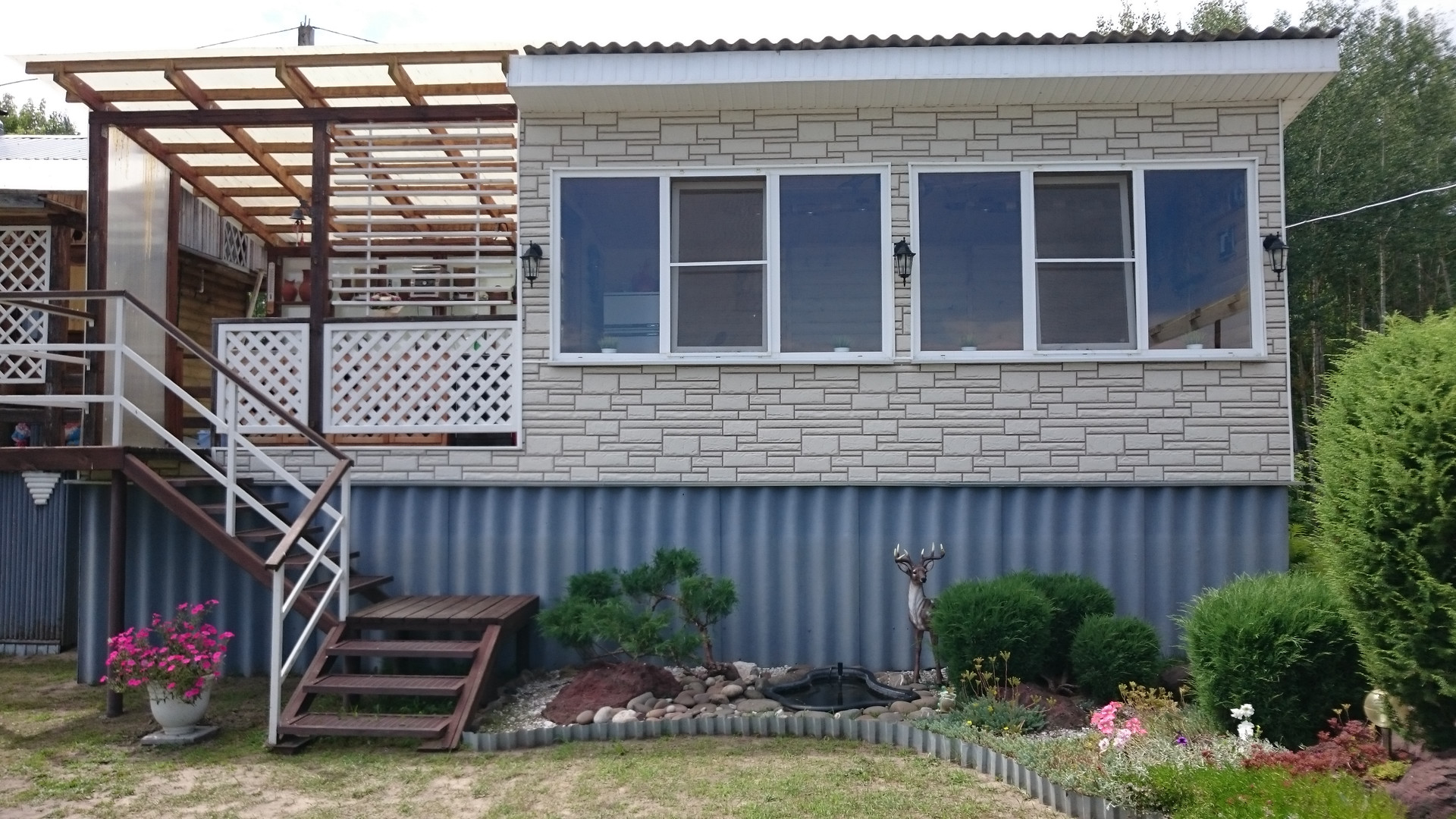 Крытые летняя кухня с террасой и мебелью. Посуда и электроприборы для самостоятельного приготовления и хранения продуктов.