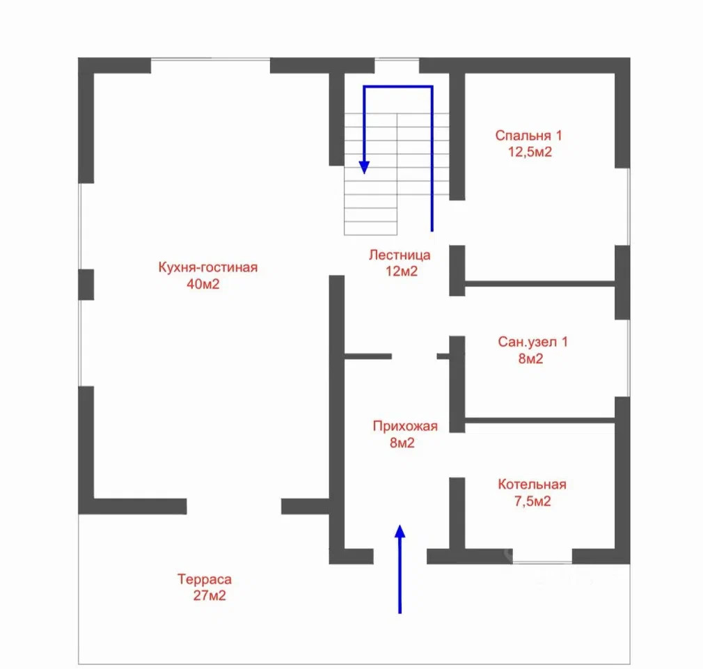 1 этаж: коридор, кухня-гостиная с выходом на терассу, гостевая спальня, гостевой санузел;