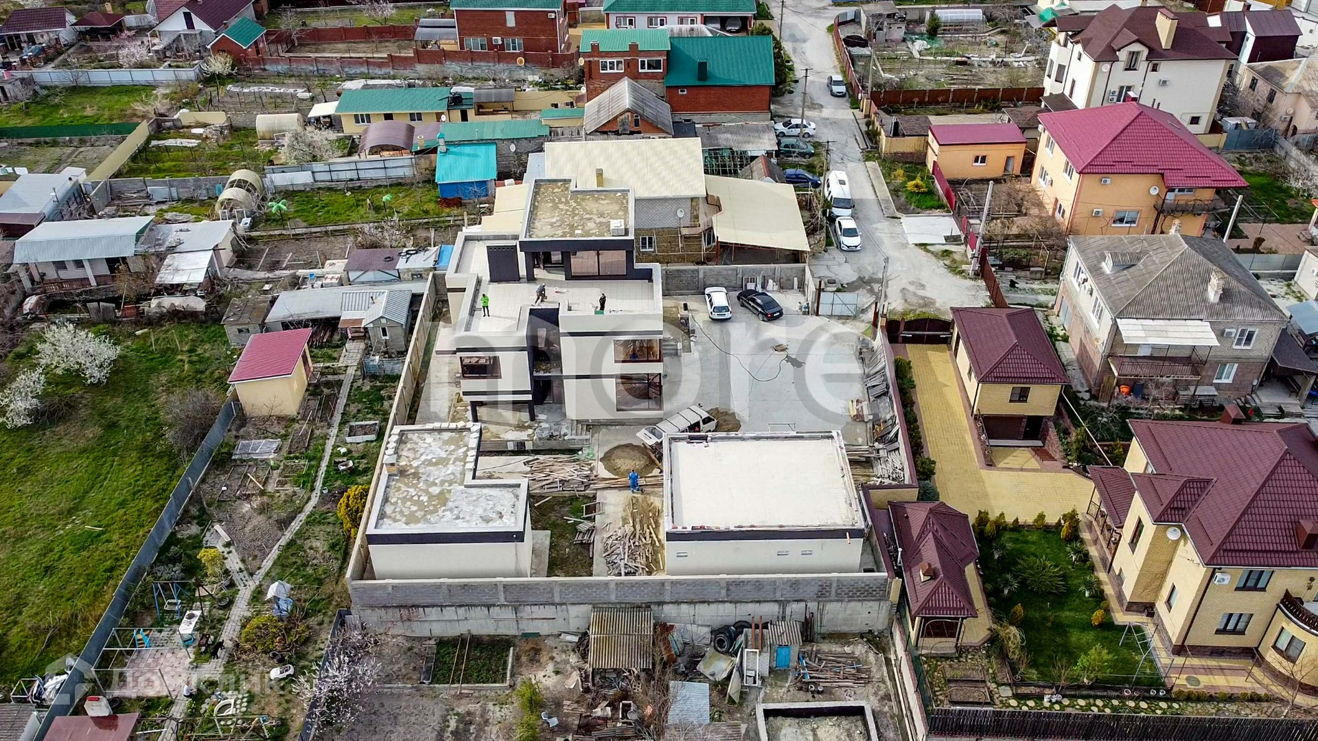 Дом 304.4 м2 построен в современном стиле качественными материалами. На территории есть отдельное строение 71 м2, состоящее из 3 отдельных комнат (гостинная она же кухня, санузел, гардеробная), для гостей, либо под аренду отдыхающим. Также есть отдельно стоящее здание 44 м2, где находится зона барбекю, баня, комната отдыха. Дом огорожен по периметру забором из керамзитоблока с подсветкой, металлические раздвижные ворота. Во дворе место для парковки более 4 машин.