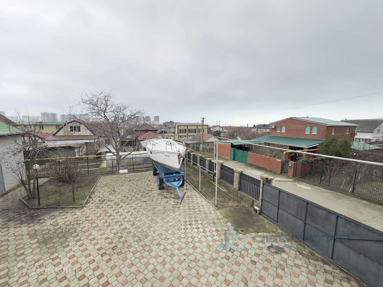 Дом огорожен забором, есть мангальная зона, домик с баней и домик для летней кухни.