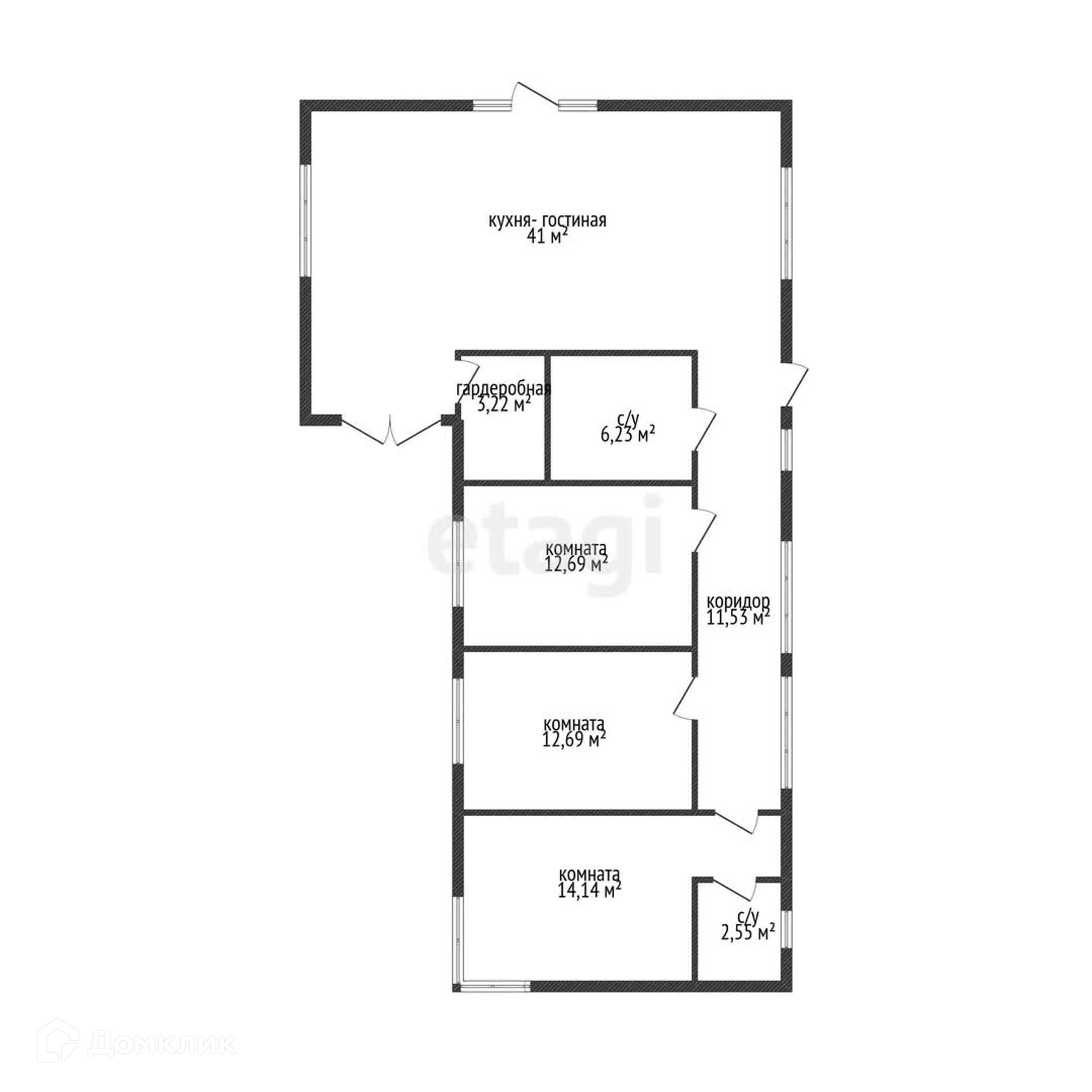 В доме 3 изолированные комнаты, большая кухня-гостиная 41 кв. м, гардеробная, 2 санузла и коридор.