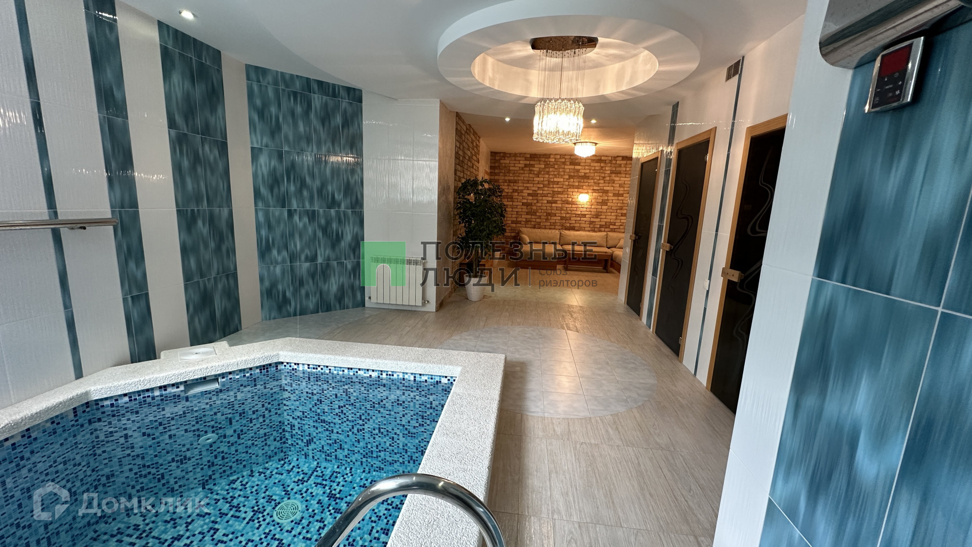 На цокольном этаже дома расположены гараж на две машины, котельная, сауна и помещение для хозяйственных нужд. Сауна, обшитая липой и абашем, является ключевым и продуманным элементом дома. Бассейн объемом 9 кубических метров и глубиной 1,5 метра оснащен системой подогрева. Мебель сделана на заказ из массива карагача, а подушки покрыты водоотталкивающей тканью.