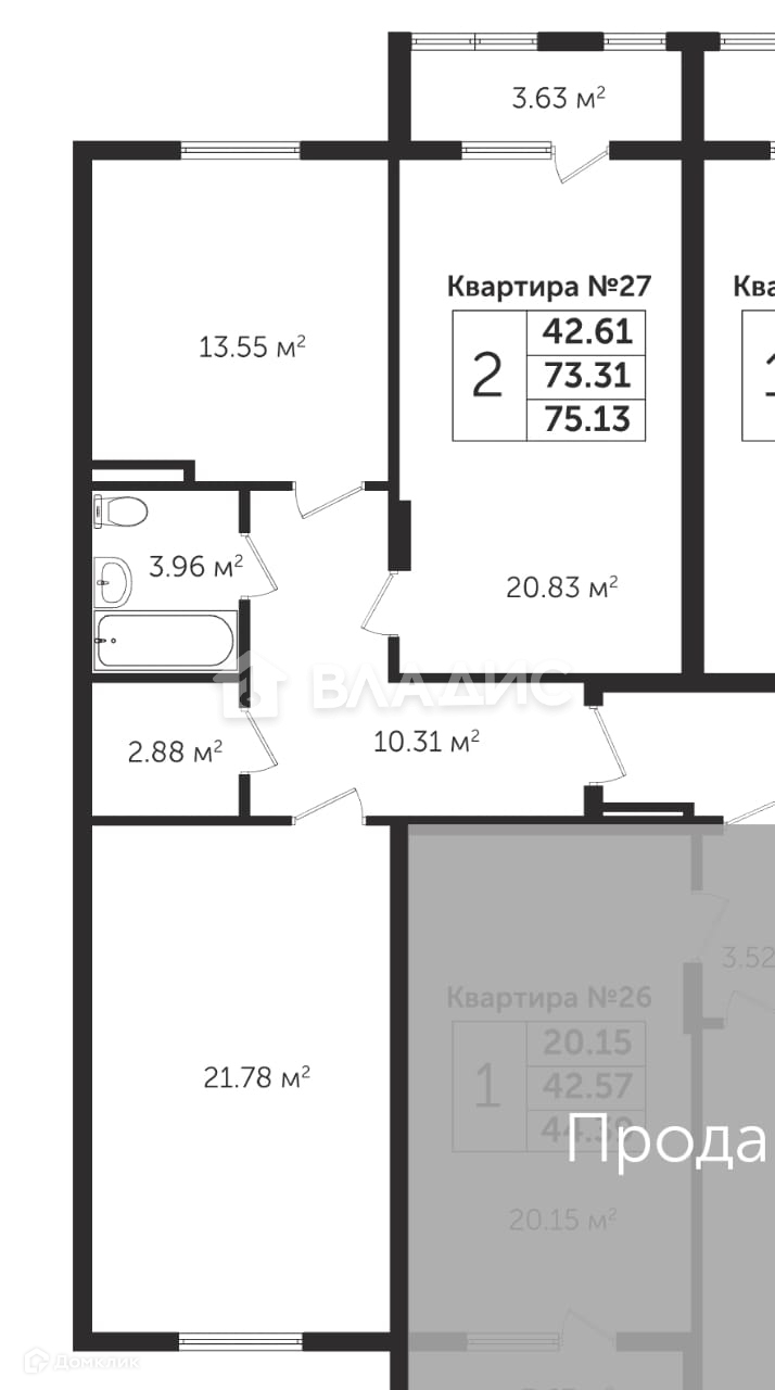 Жилая площадь 42.61 м2
