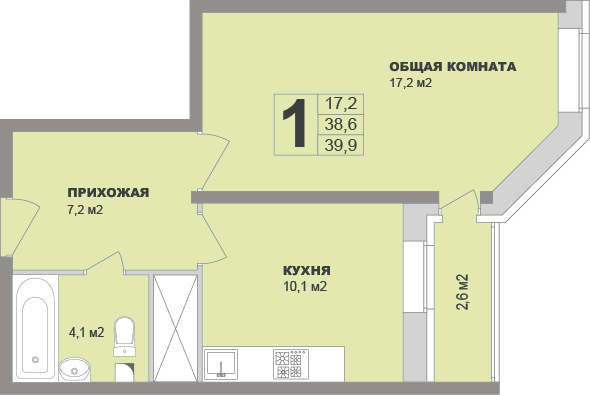 Общая площадь 39.9 м2