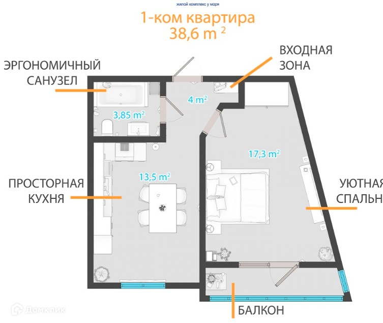 Жилая площадь 17.3 м2