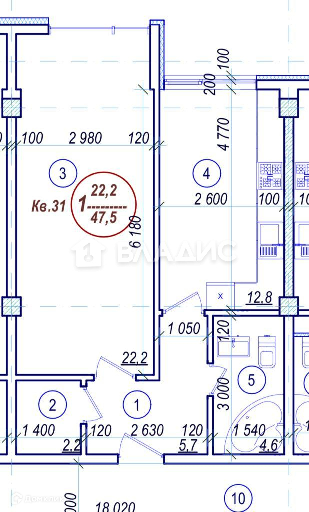 Общая площадь 47.5 м2