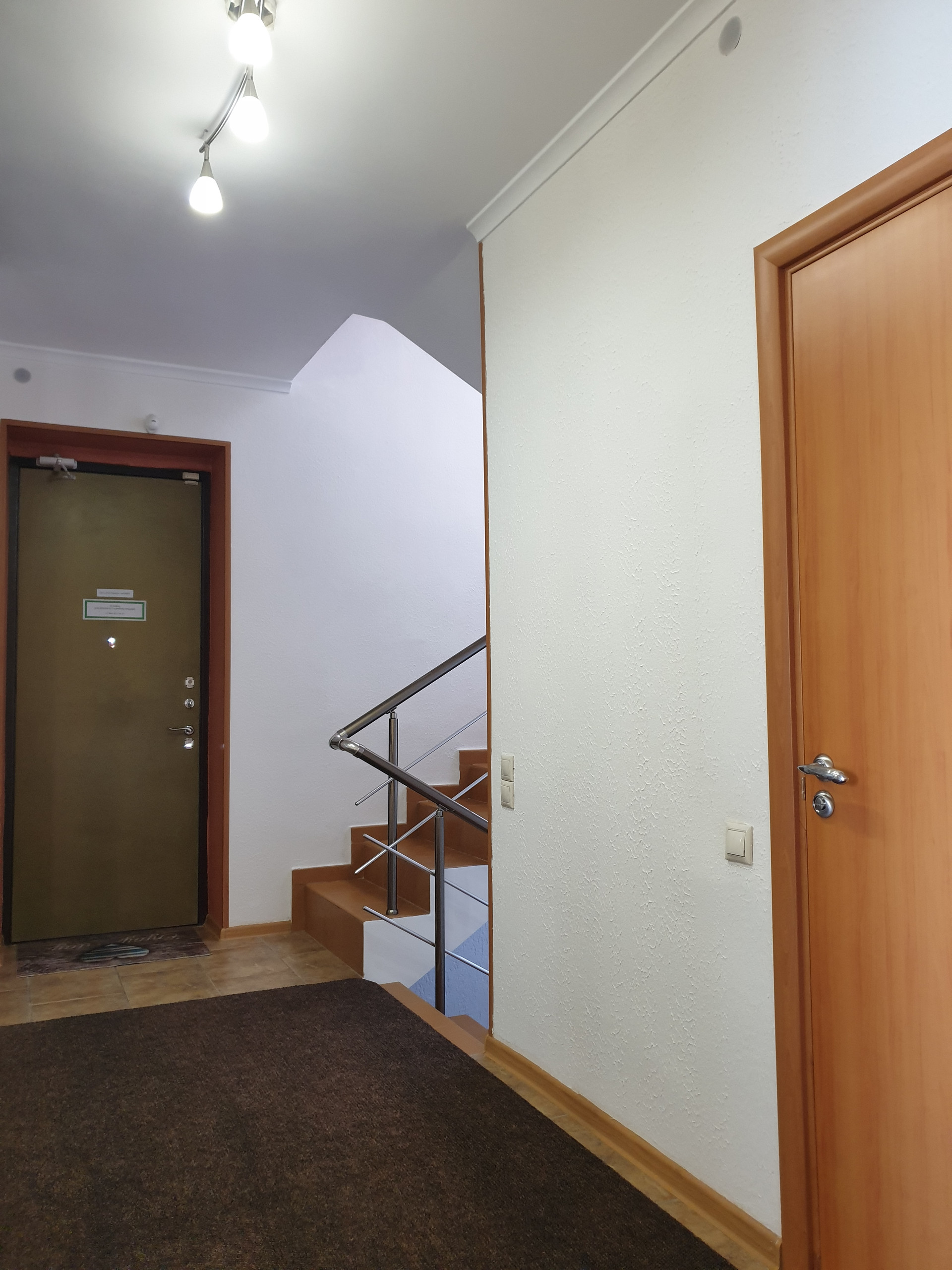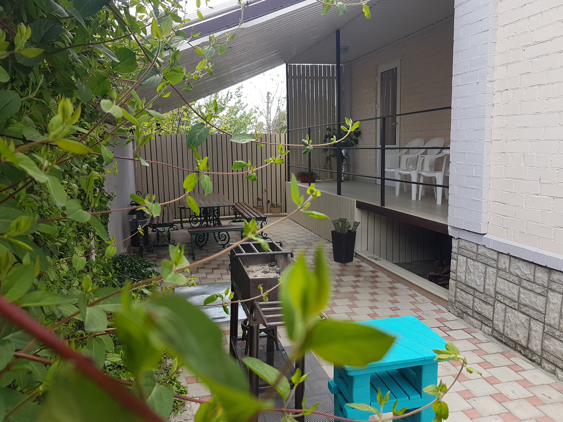 Дом оборудован сигнализацией, в доме и на прилегающей территории  Wi-Fi с хорошей скоростью. Рядом с домом парковка для автомобиля. Есть зонты, лежаки, терраса с мангалом, батут и детские игрушки. Оборудованы зоны для отдыха и караоке.