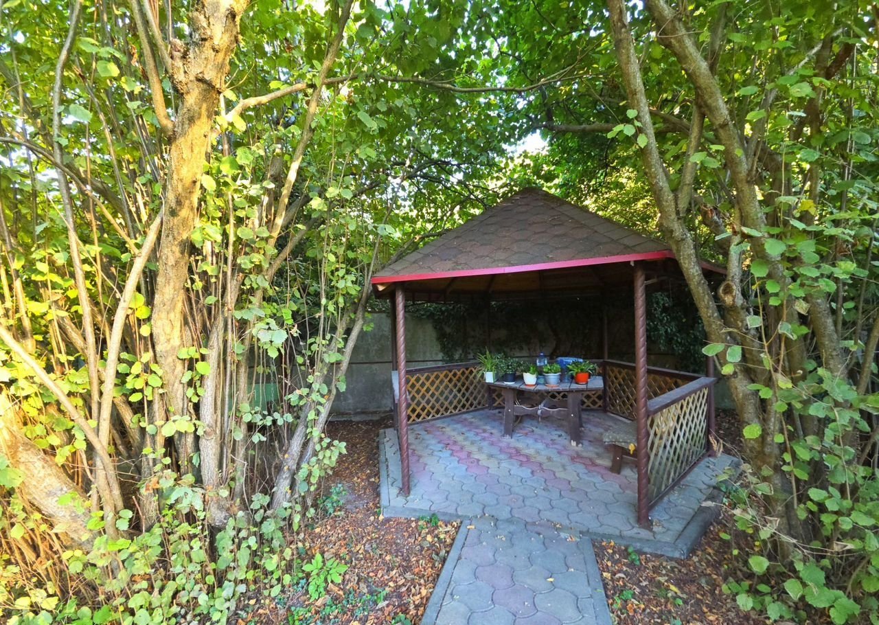 Ухоженная территория с зеленым газоном, аккуратными дорожками, зоной для отдыха и обедов на свежем воздухе в беседке. Здесь можно установить надувной бассейн или качели — место позволяет реализовать любые идеи.
