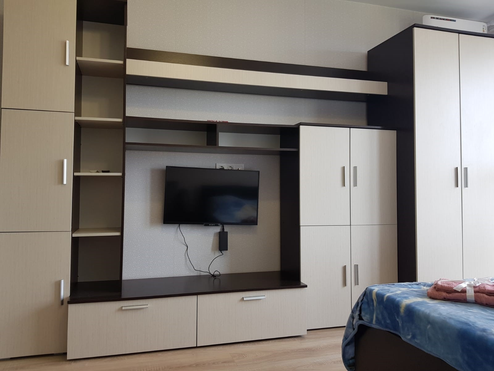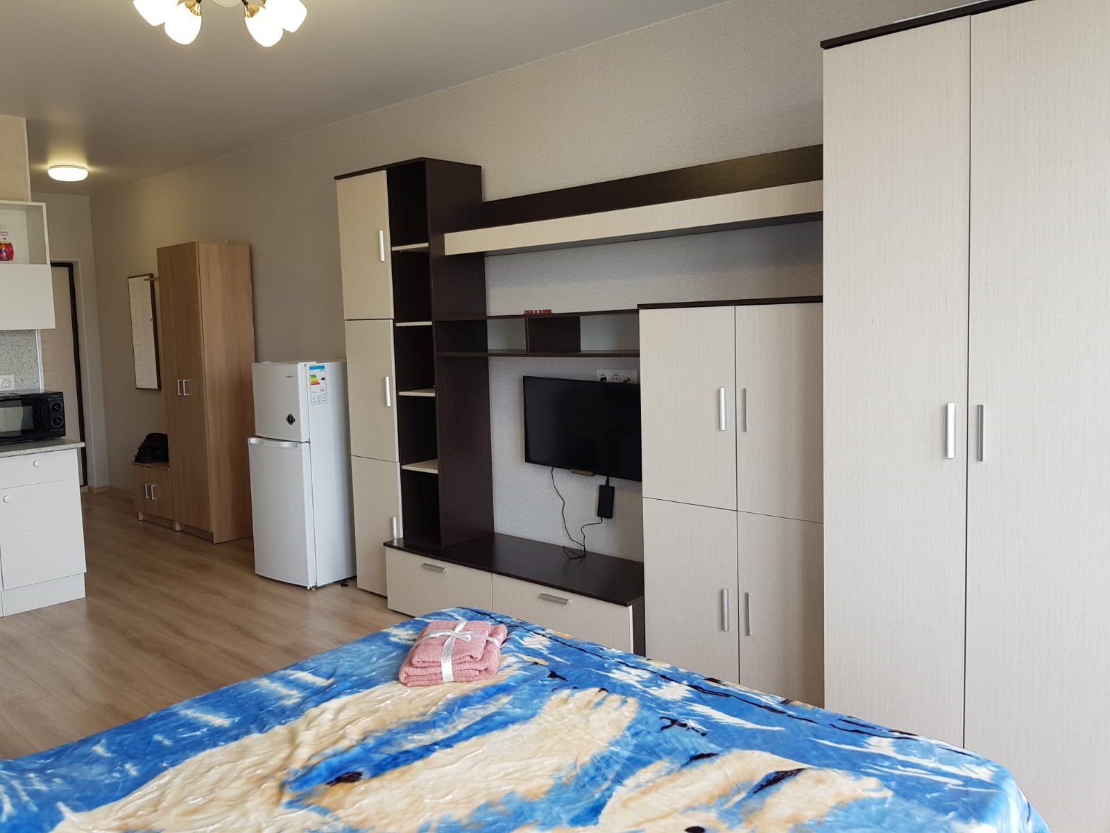 Есть все необходимое: постельное белье, полотенца, посуда, стиральная машина, холодильник, микроволновая печь, чайник, телевизор, сплит-система, утюг, гладильная доска. Всё новое.