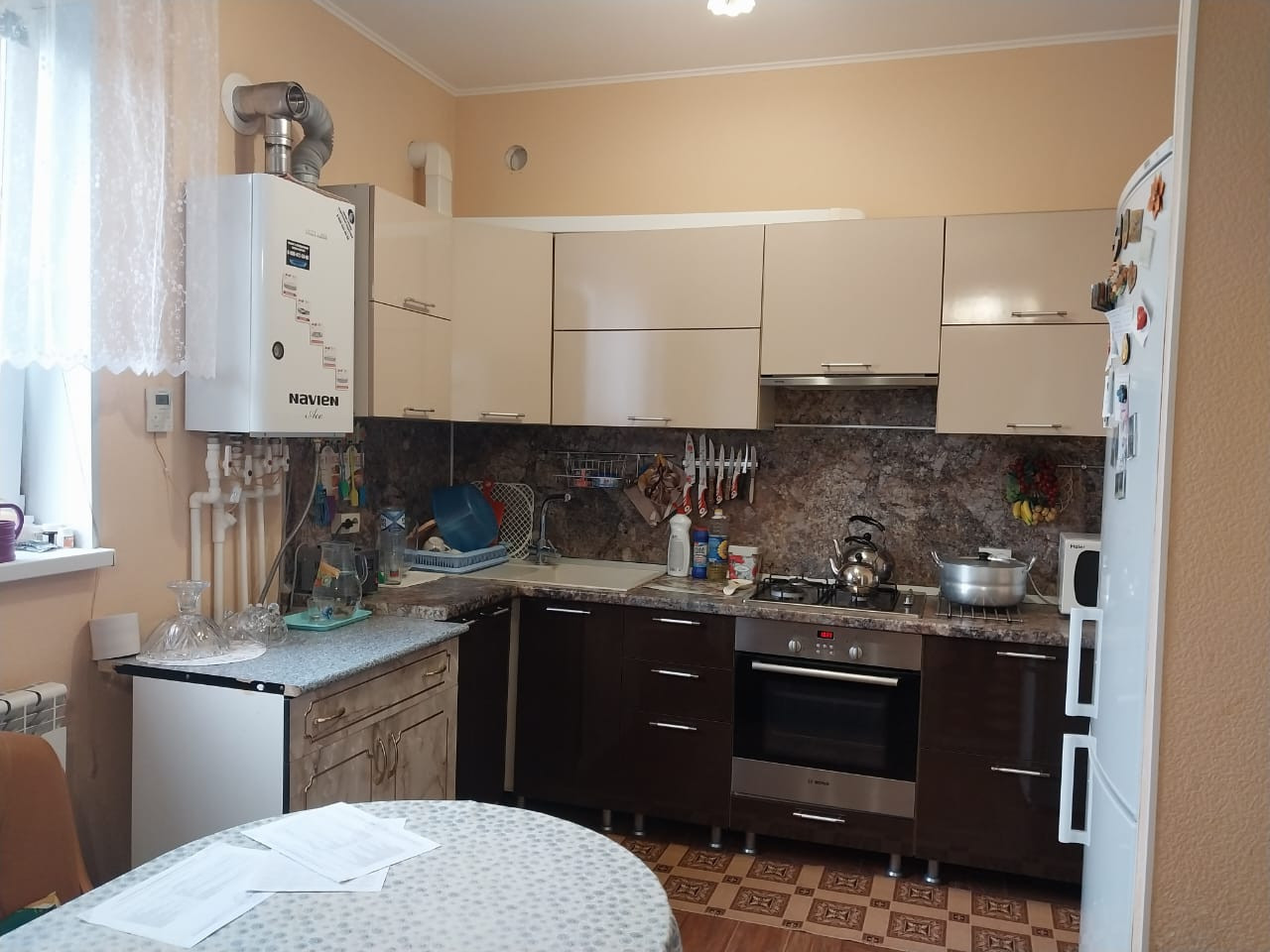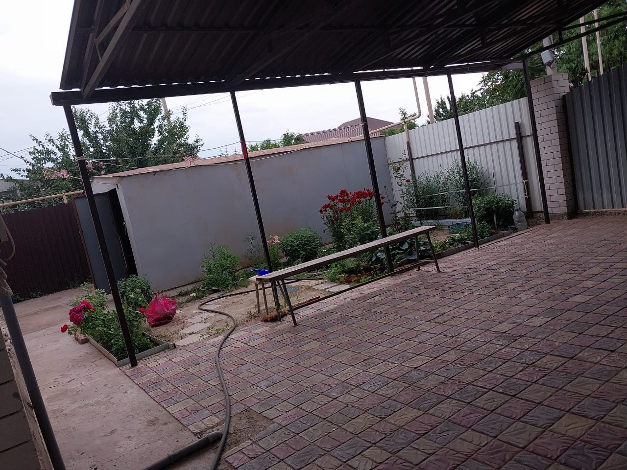 дом кирпичный, теплый. 2013 года, 4 комнаты, зал-кухня, три спальни, санузел совмещенный, прихожая. во дворе металлический навес, гараж, летняя кухня и баня, уличный туалет.