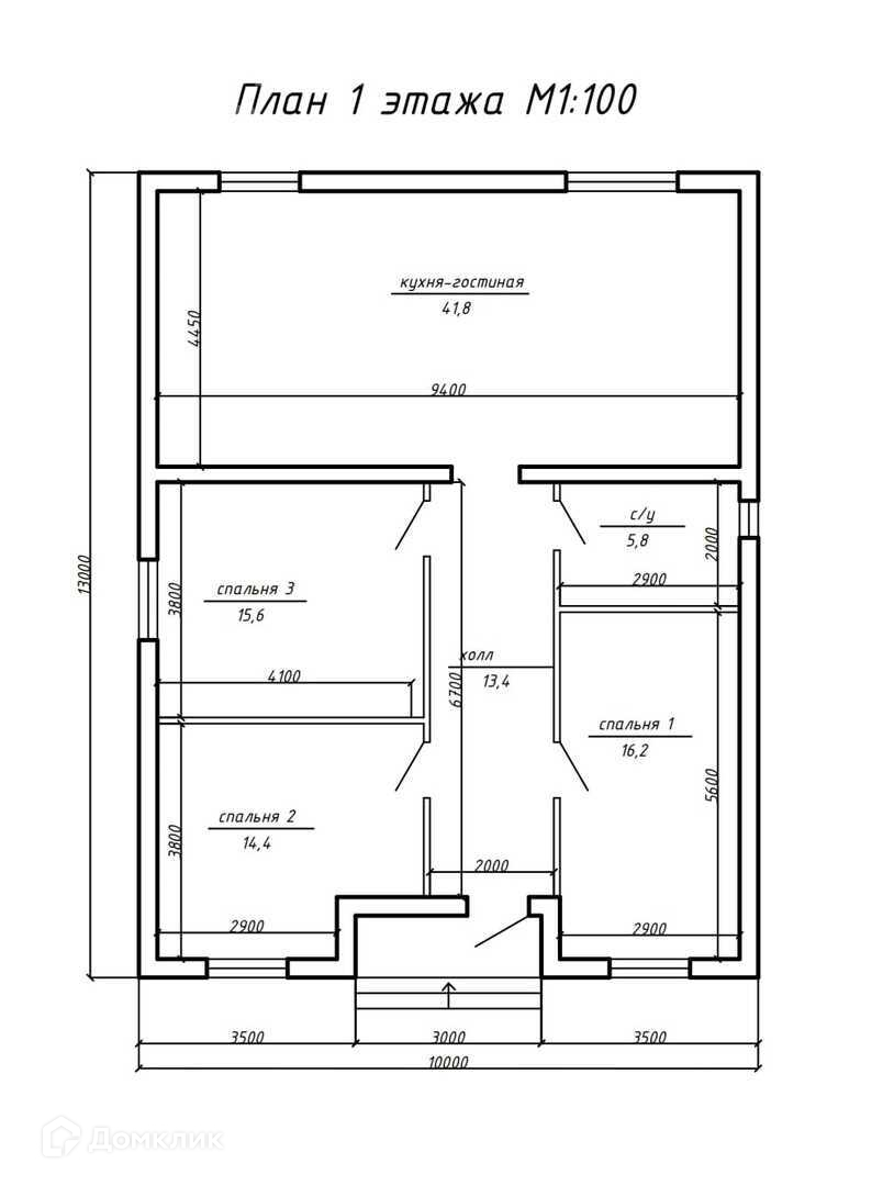 Дом состоит из большой кухни-гостиной 41.8 м2 с панорамным окном - выходом на террасу, трех спальных комнат 15.6 м2, 14.4м2 (с панорамным окном) и 16.2м2 (с панорамным окном), совмещенного санузла 5.8м2, холла 13.4 м2.
