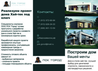 Компания Открытый мир предлагает к продаже новый дом в современном стиле "Хай-тек". Светлый, просторный, тёплый, всё самое важное для основных параметров выбора дома здесь присутствует, благодаря редкому качеству постройки дома из современных материалов, с большими окнами и отличной планировкой. Здесь вам обеспечен максимальный комфорт и удобство проживания. Планировк... |