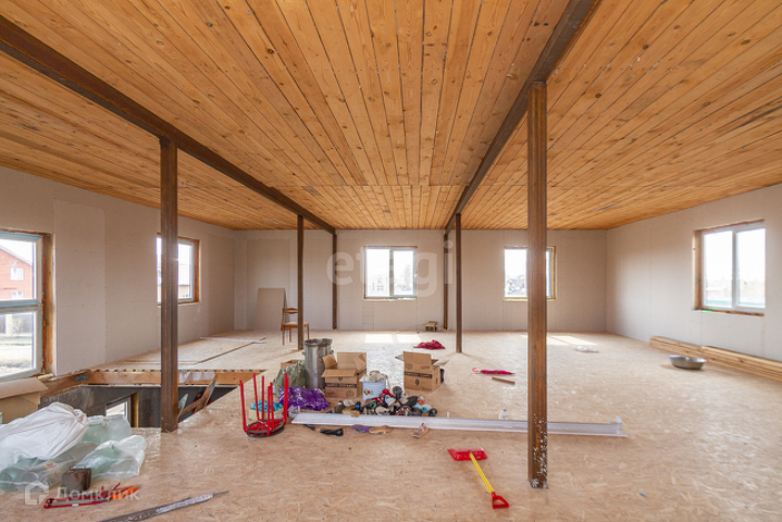 В доме идет чистовая отделка, первый и второй этаж сделан пол и стены , установлены окна и двери.