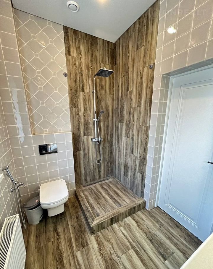 в санузле установлен унитаз, раковина, душевая кабинка