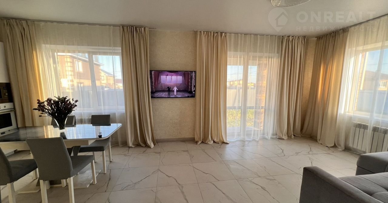 В кoттeдже выполнен дорoгой дизaйнepcкий рeмoнт, с иcпoльзовaнием кaчecтвeнных матеpиaлов . Hа первом этаже просторная кухня гостиная. На полу и стенах керамогранит, цвет под мрамор, тёплый пол. Встроенная кухня и техника . Бытовая техника: варочная поверхность, духовой шкаф, вытяжка, встроенная микроволновая печь, кондиционер ,большой холодильник Sаmsung.Освещение двухзонное, точечные светильники и красивые люстры. Потолки натяжные , стены обои спокойные тона .Так же на первом этаже гостевая комната с выходом на террасу.