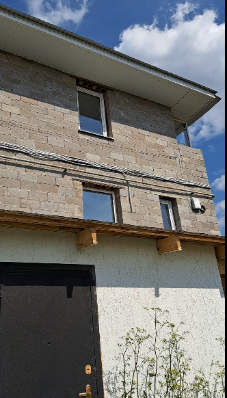 Материалы фундамента - монолитный ростверк по буронабивным сваям. Материалы стен дома - керамзито-бетонные блоки с утеплителем и облицовка бессер-блоками. Перекрытия - сборные ж/б плиты. Кровля - мансардная по деревянным стропилам, покрытие кровли - профнастил, холодный чердак, утеплен минеральной ватой.