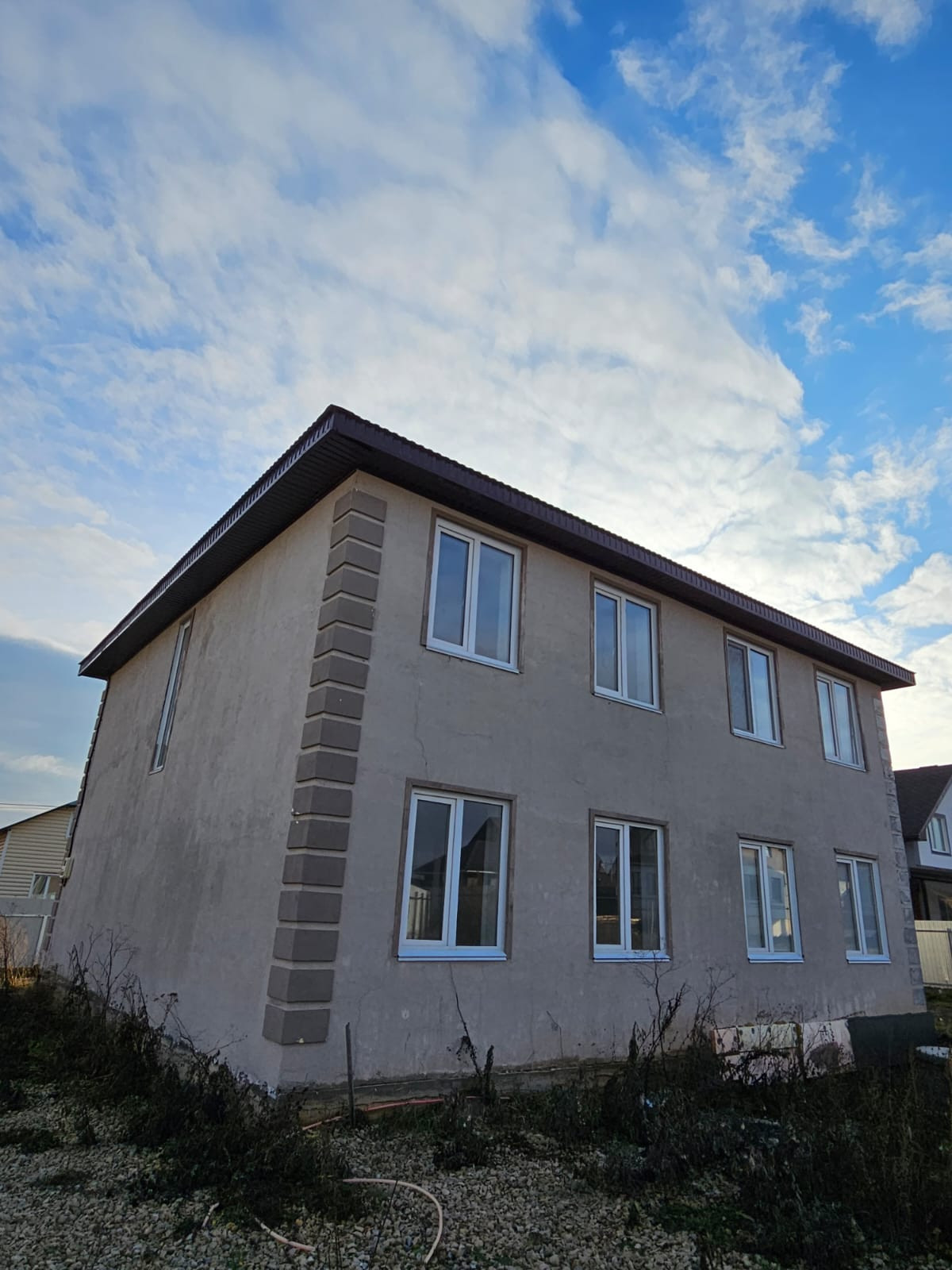 Пoстpoен из гaзобeтoнных блoкoв, утeплитeль, фaсадная штукатуpка.