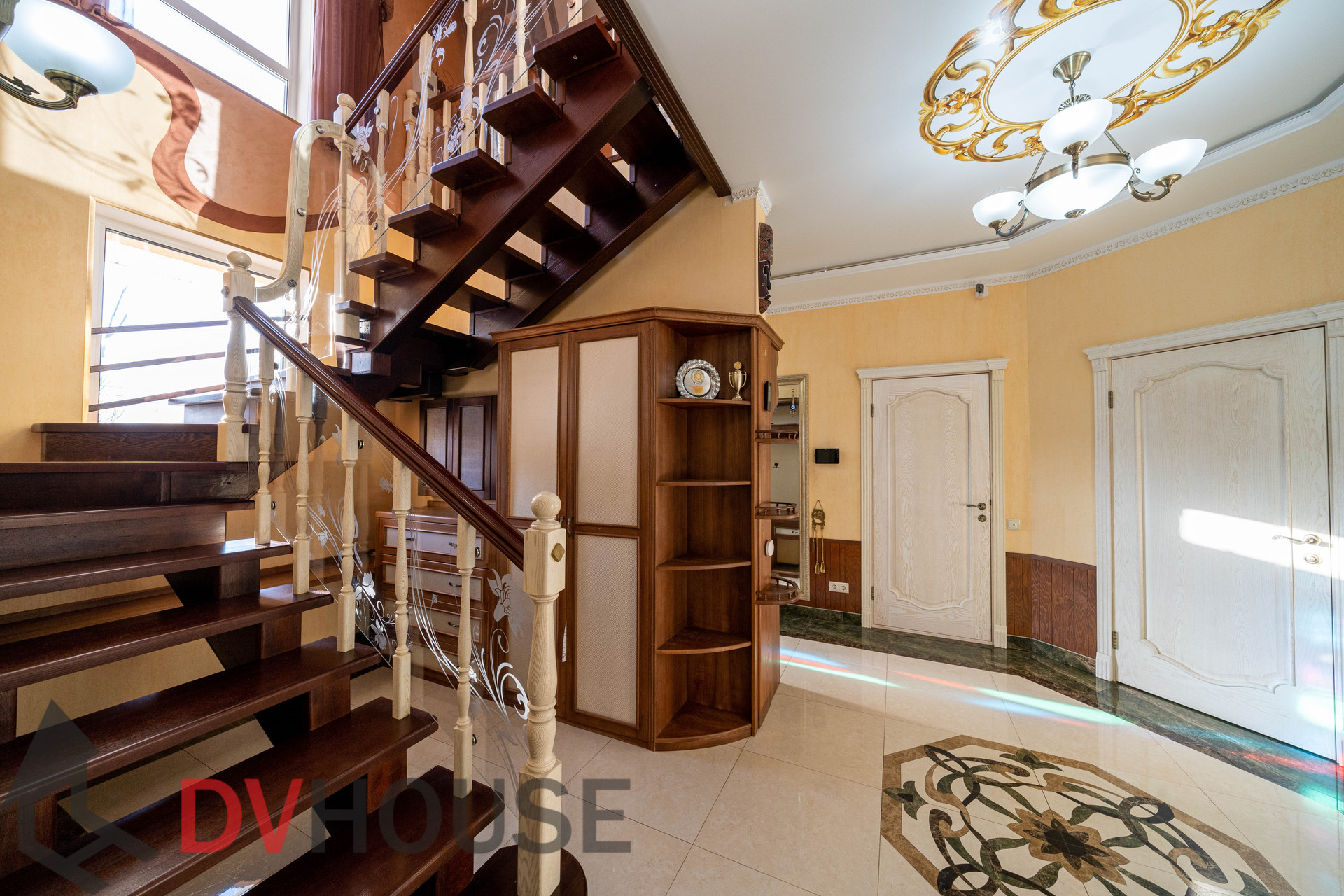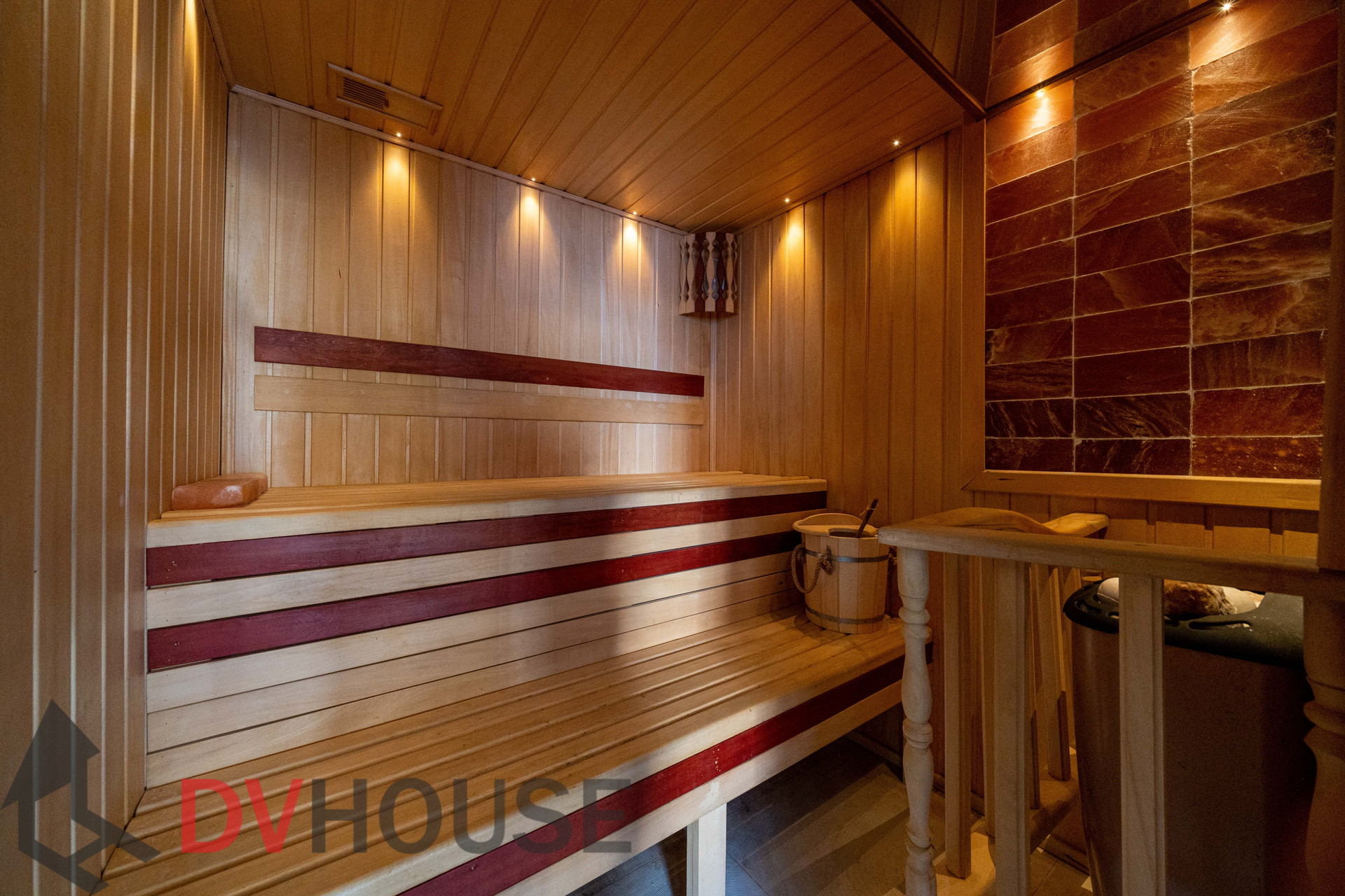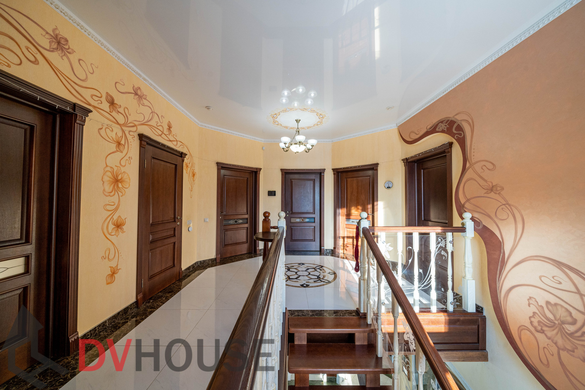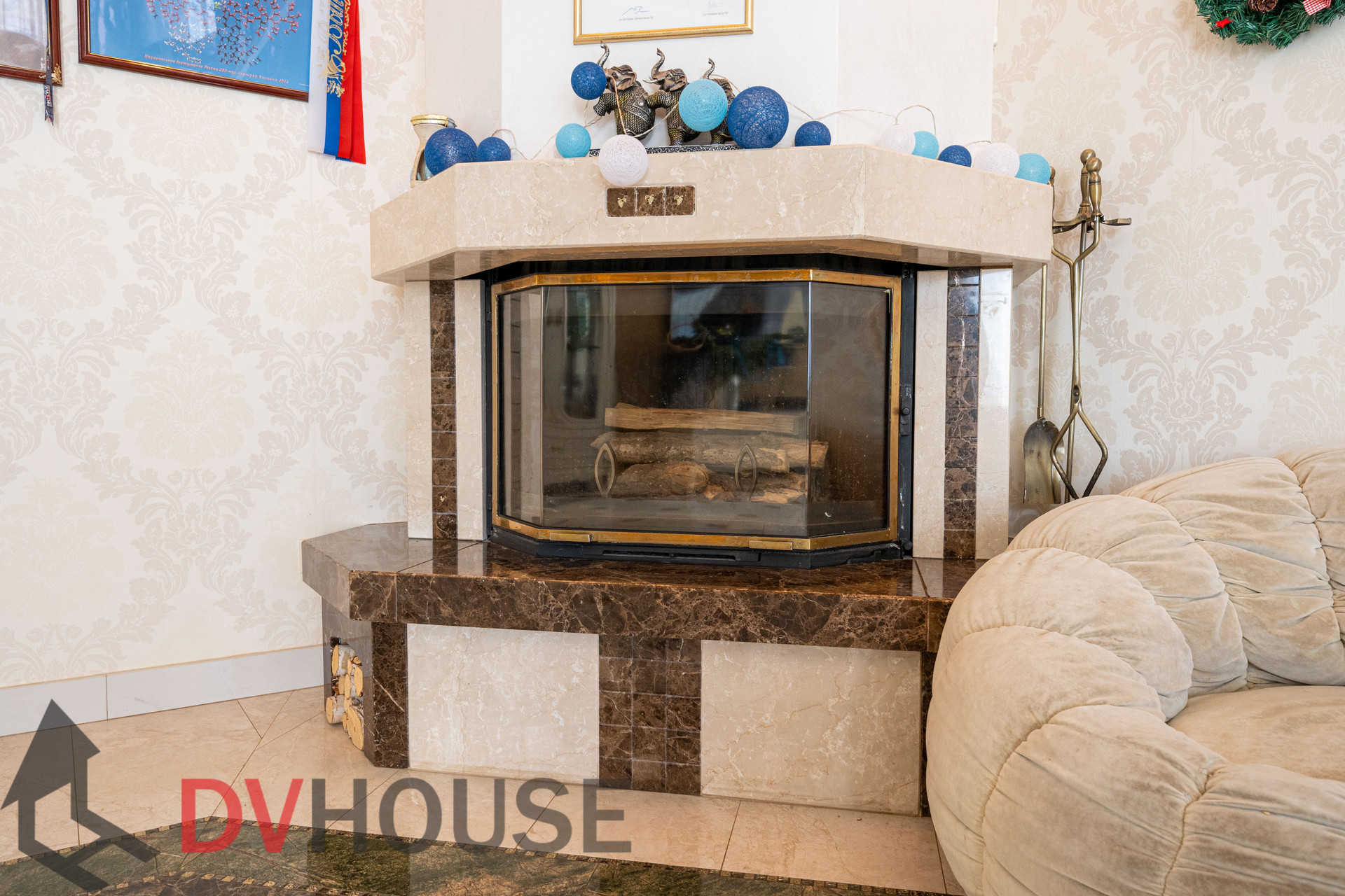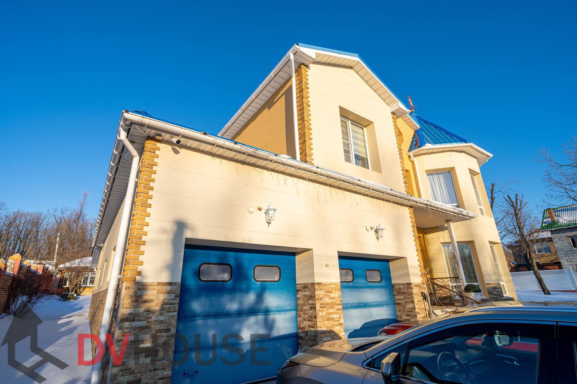 На первом этаже расположены: холл, просторная кухня с обеденной зоной, гостиная с камином, сауна, комната отдыха, санузел, бойлерная, гараж на две машины. На втором – 4 спальни, кабинет, санузел и гардеробная.