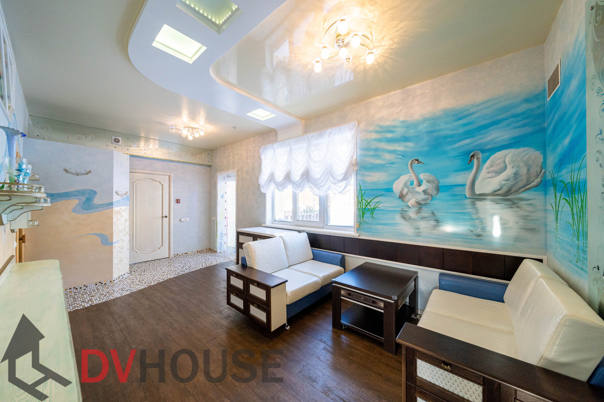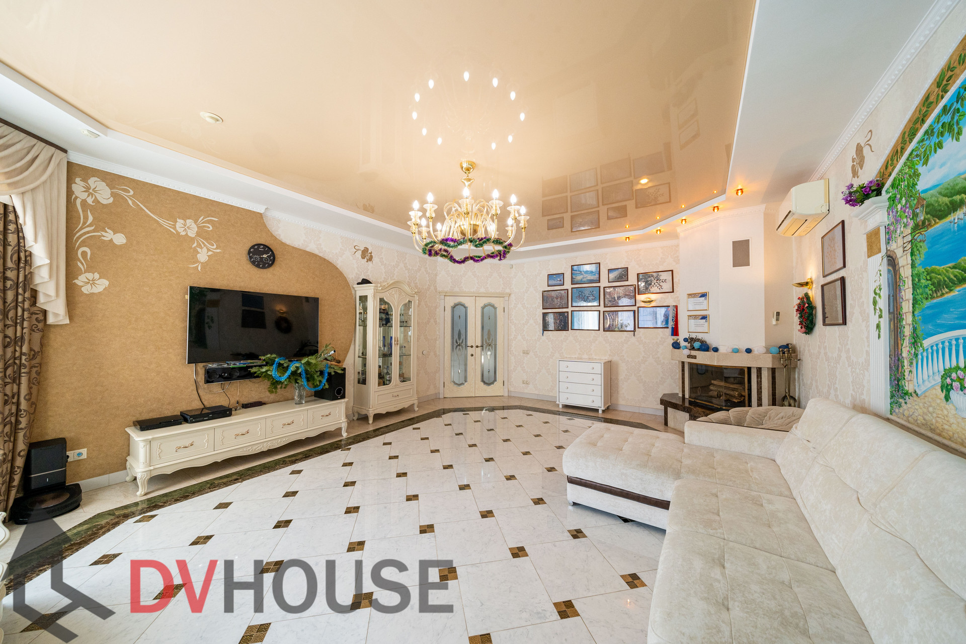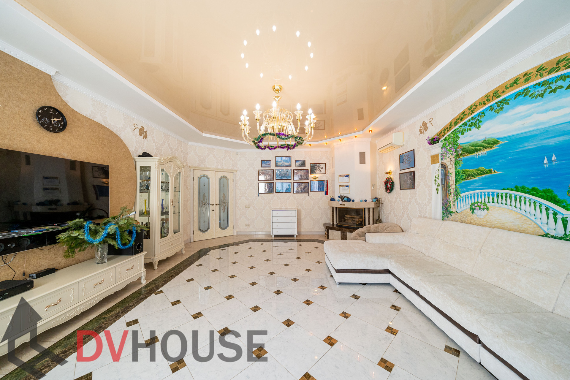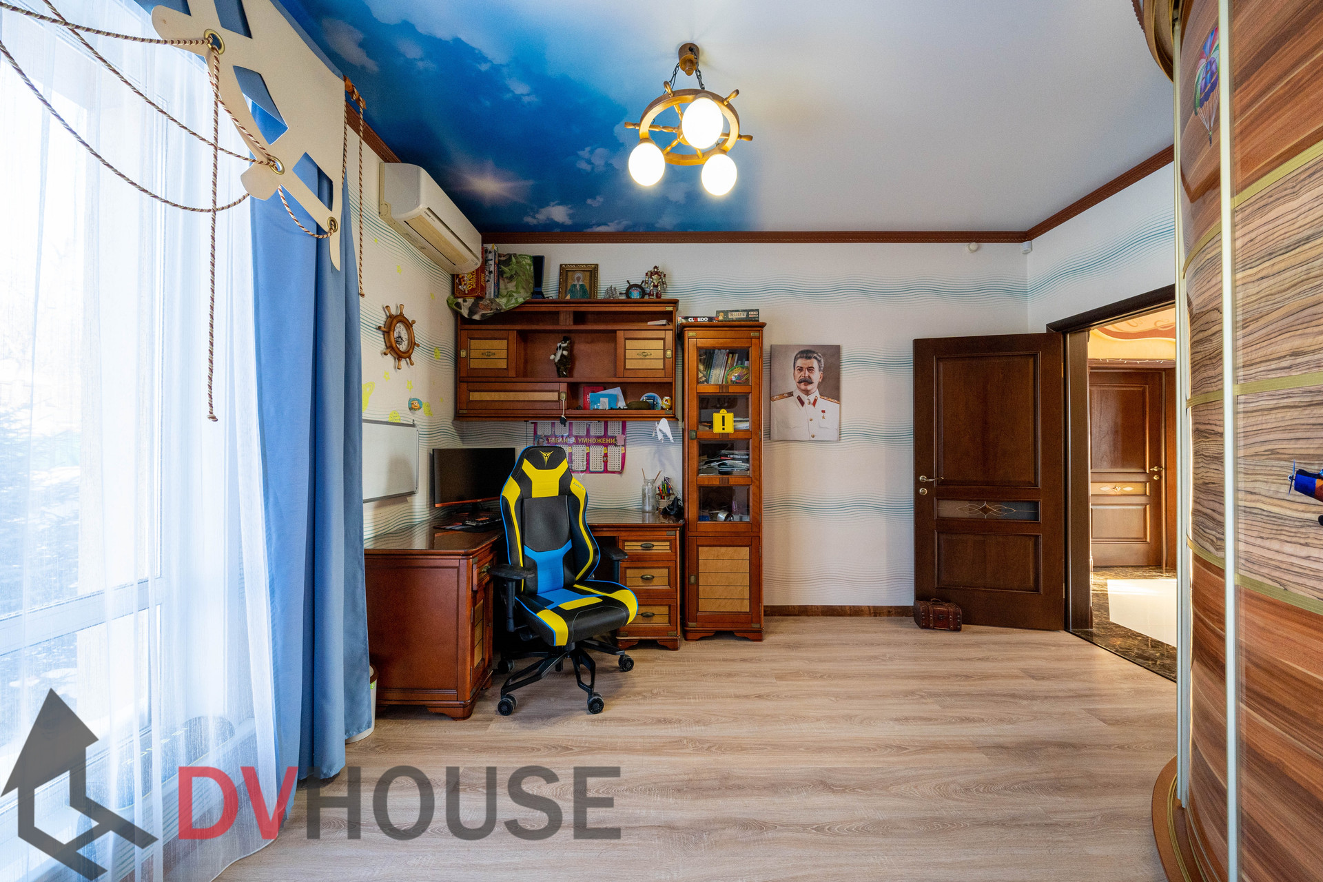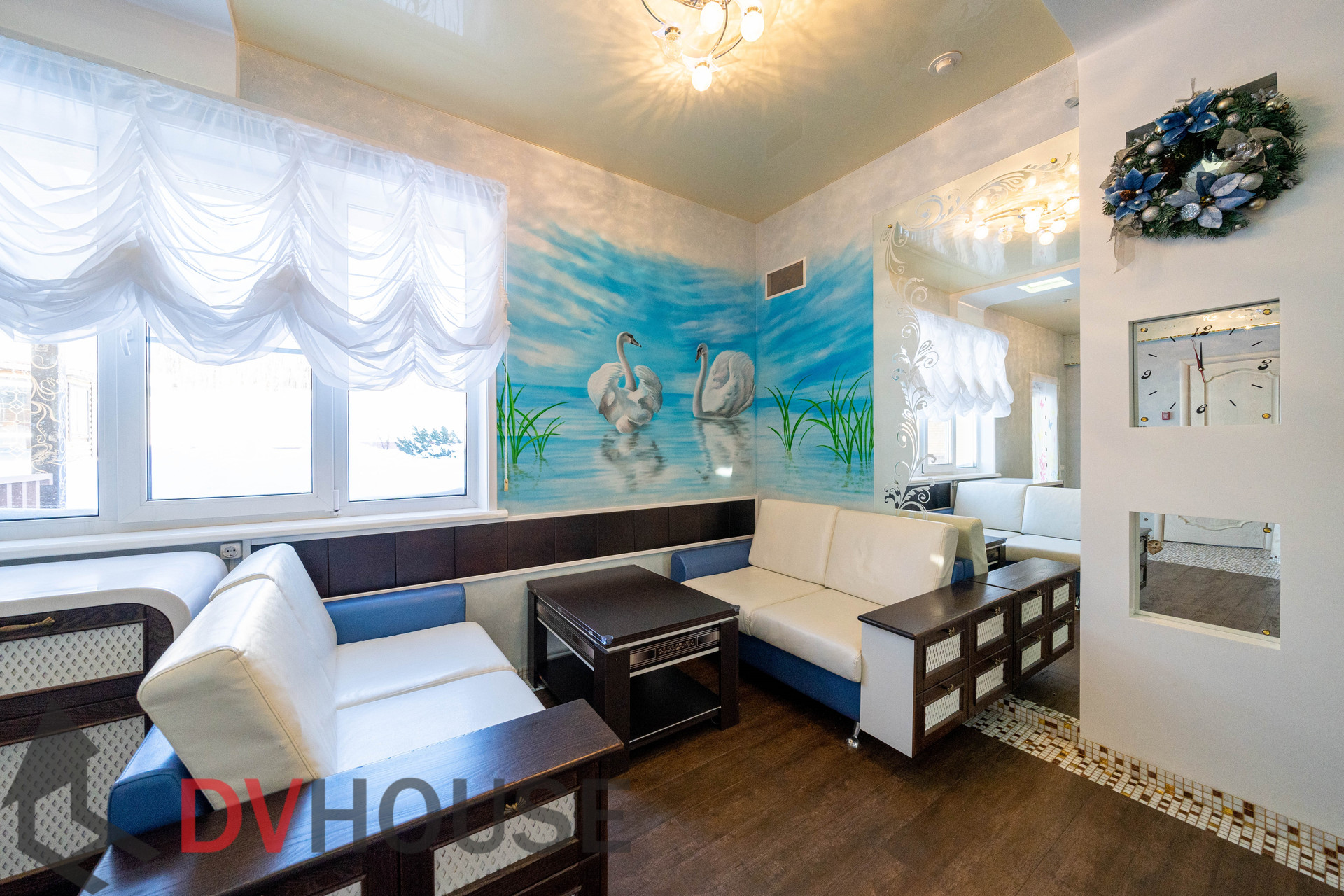 На первом этаже расположены: холл, просторная кухня с обеденной зоной, гостиная с камином, сауна, комната отдыха, санузел, бойлерная, гараж на две машины. На втором – 4 спальни, кабинет, санузел и гардеробная.
