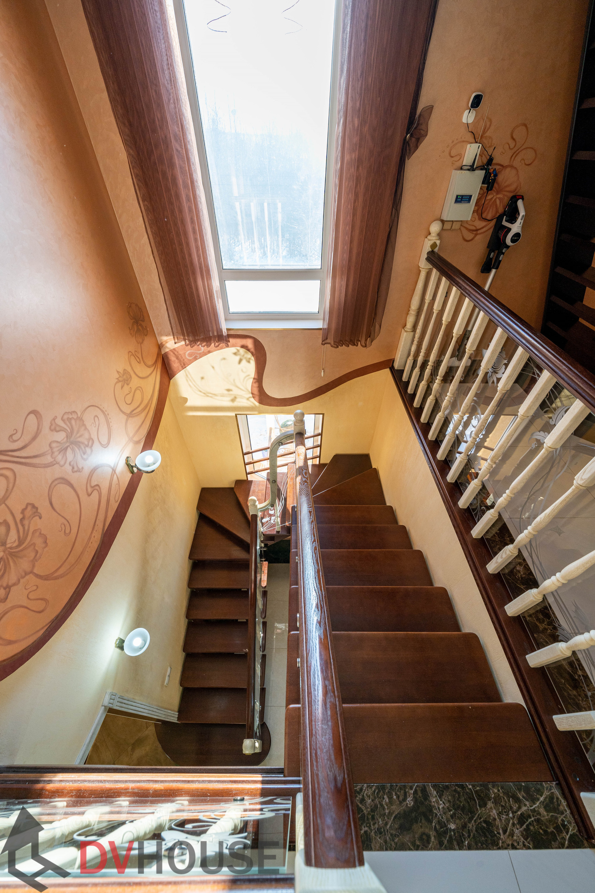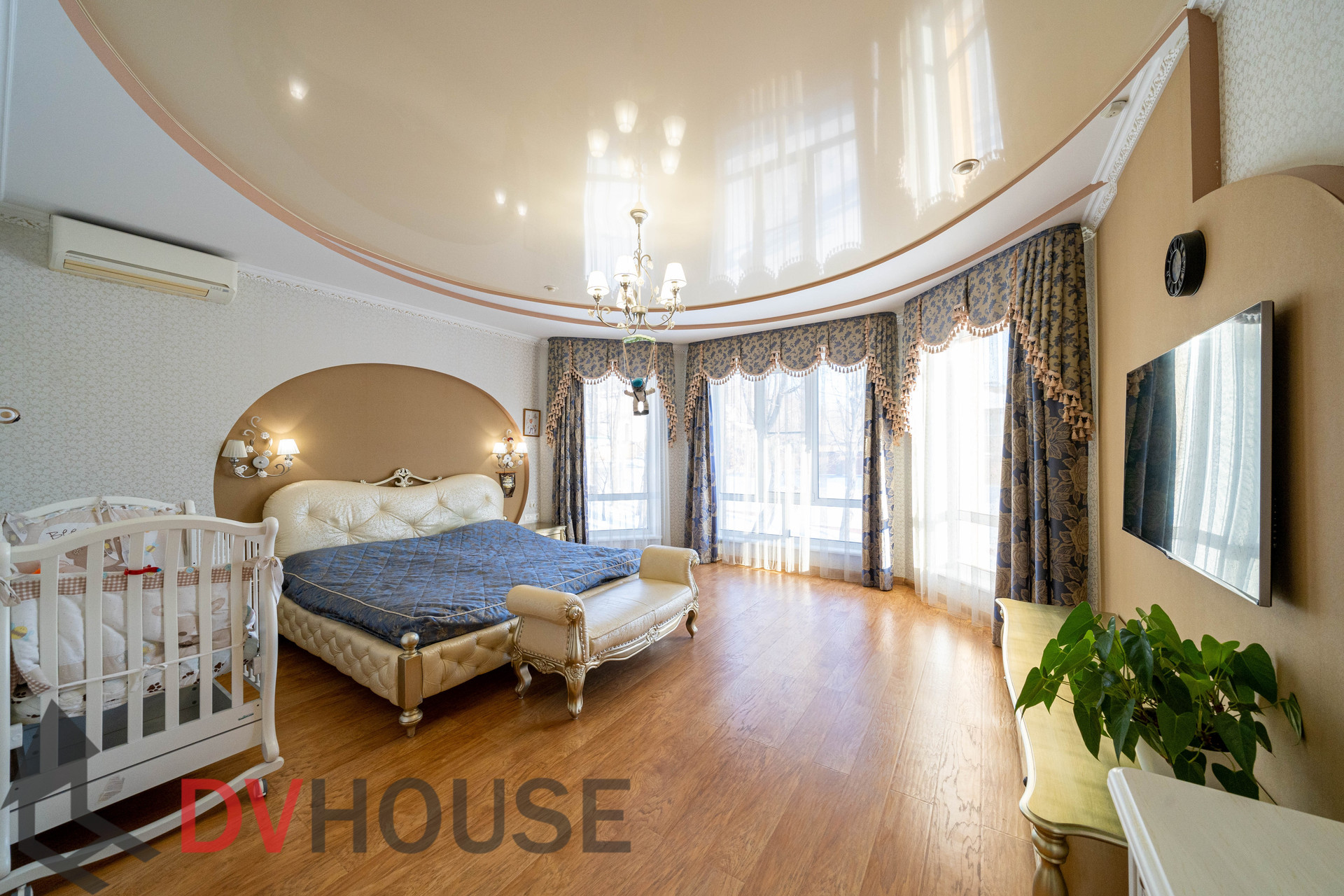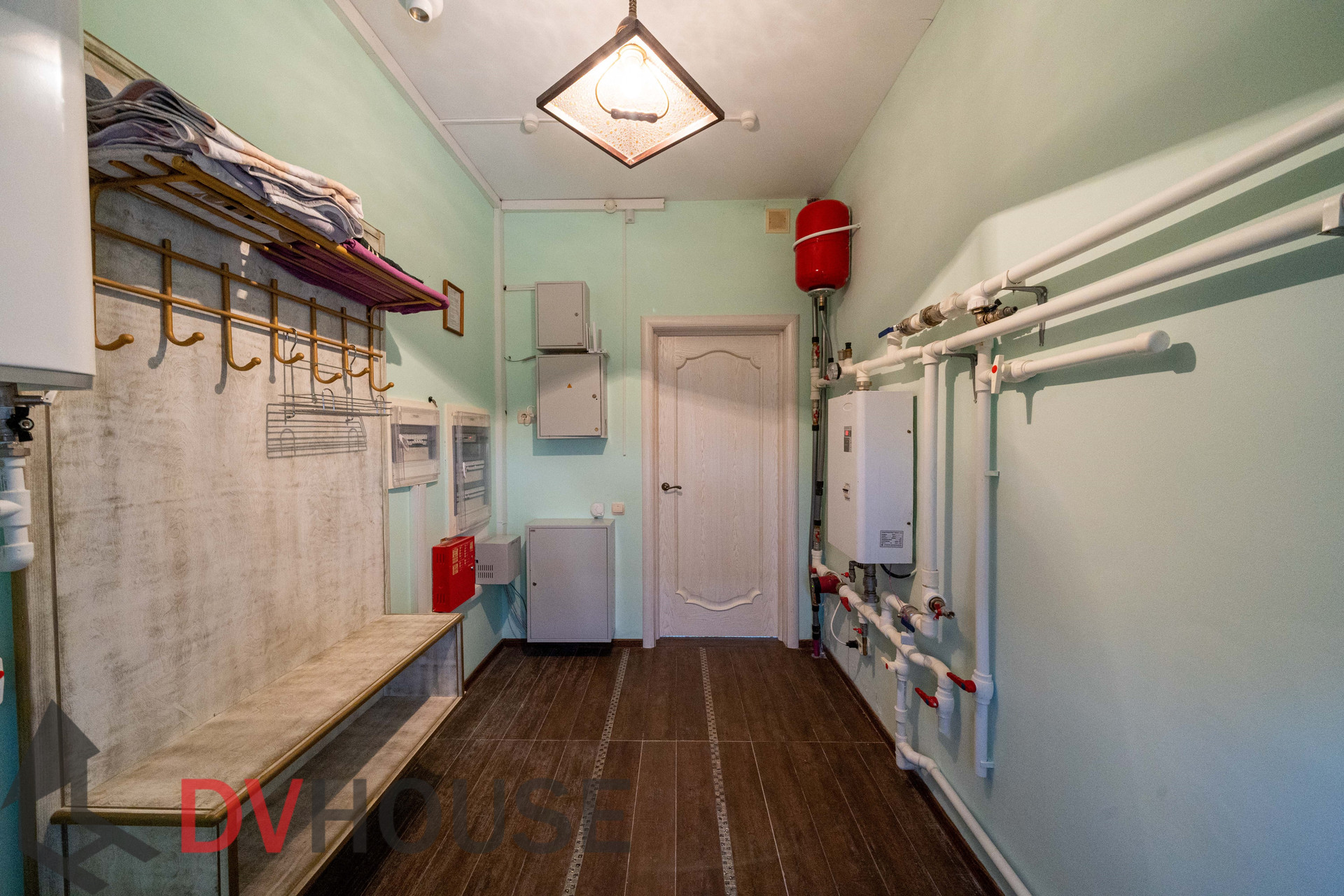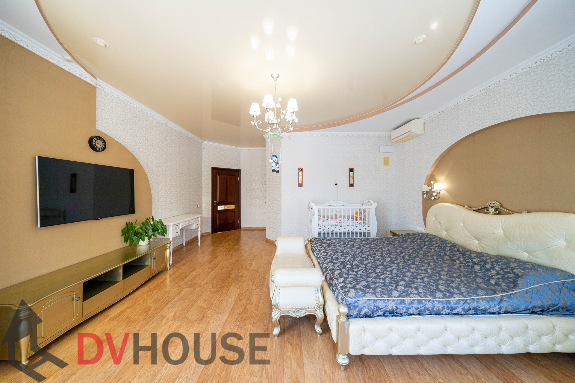На первом этаже расположены: холл, просторная кухня с обеденной зоной, гостиная с камином, сауна, комната отдыха, санузел, бойлерная, гараж на две машины. На втором – 4 спальни, кабинет, санузел и гардеробная.