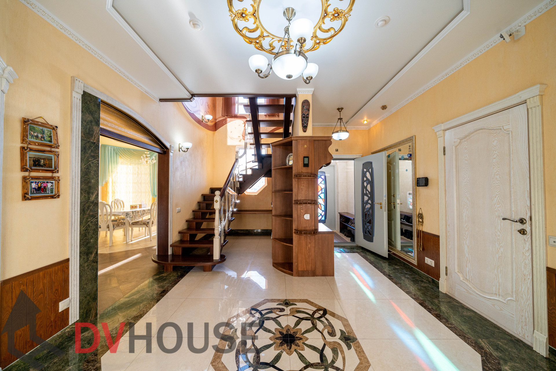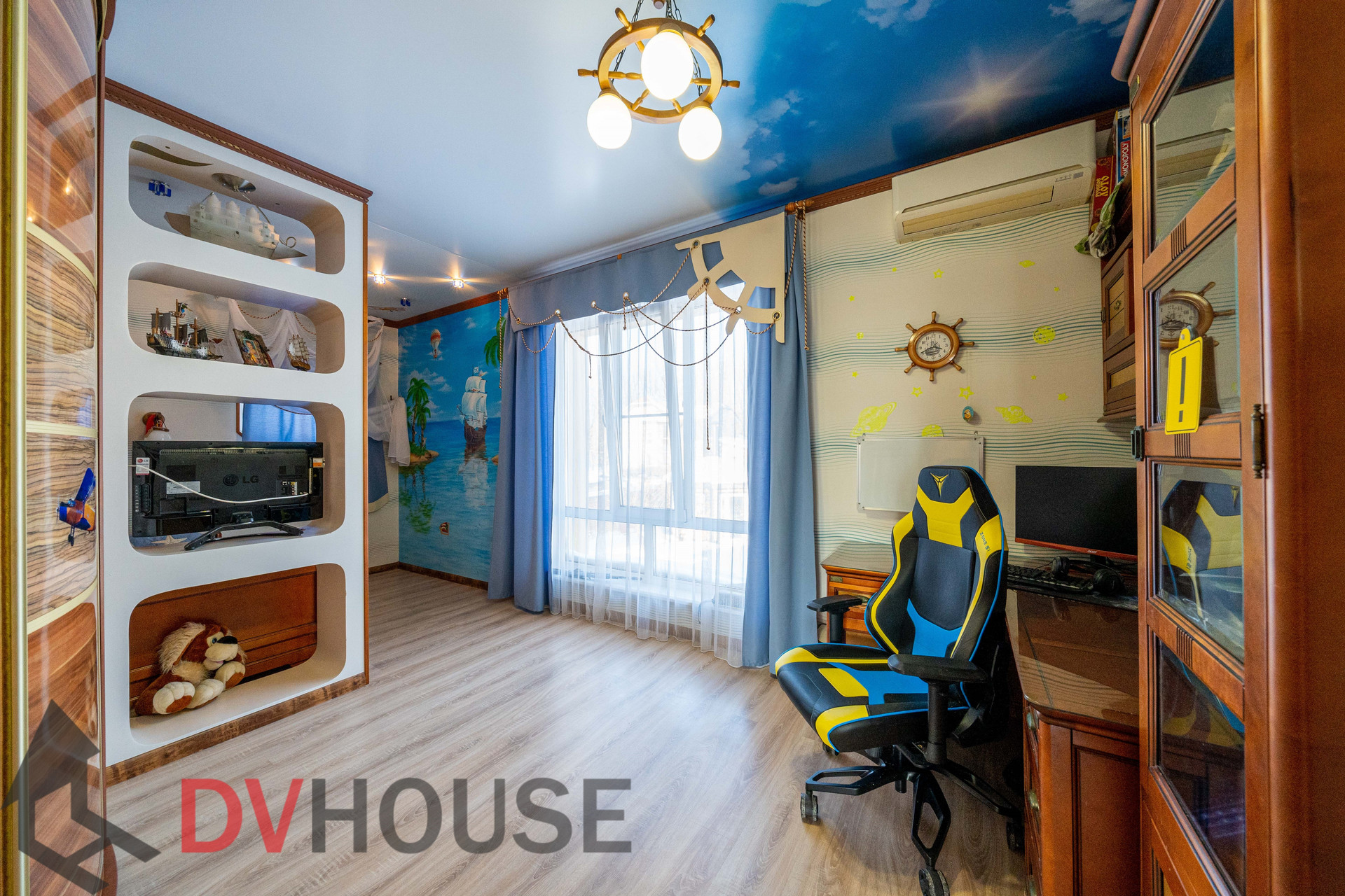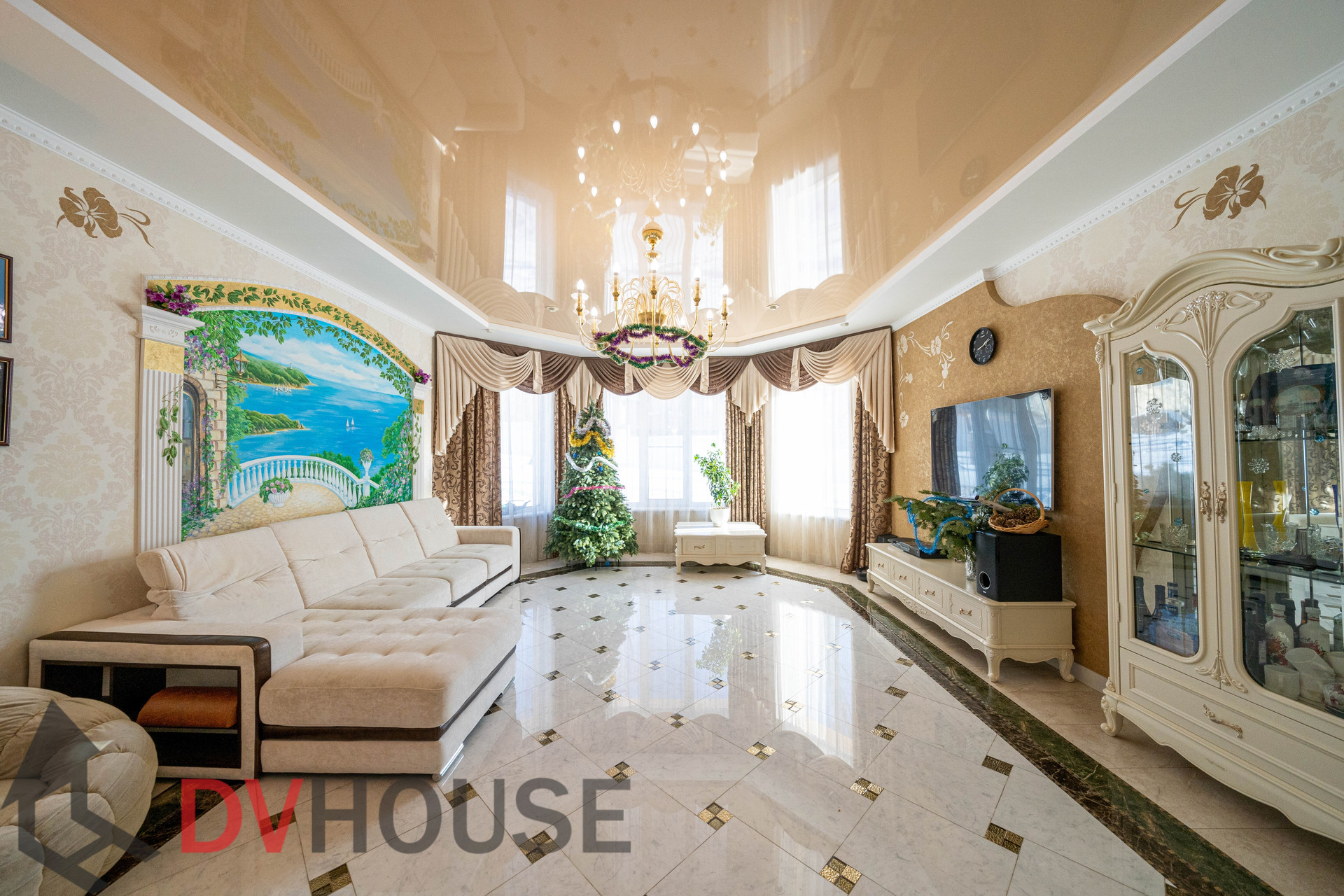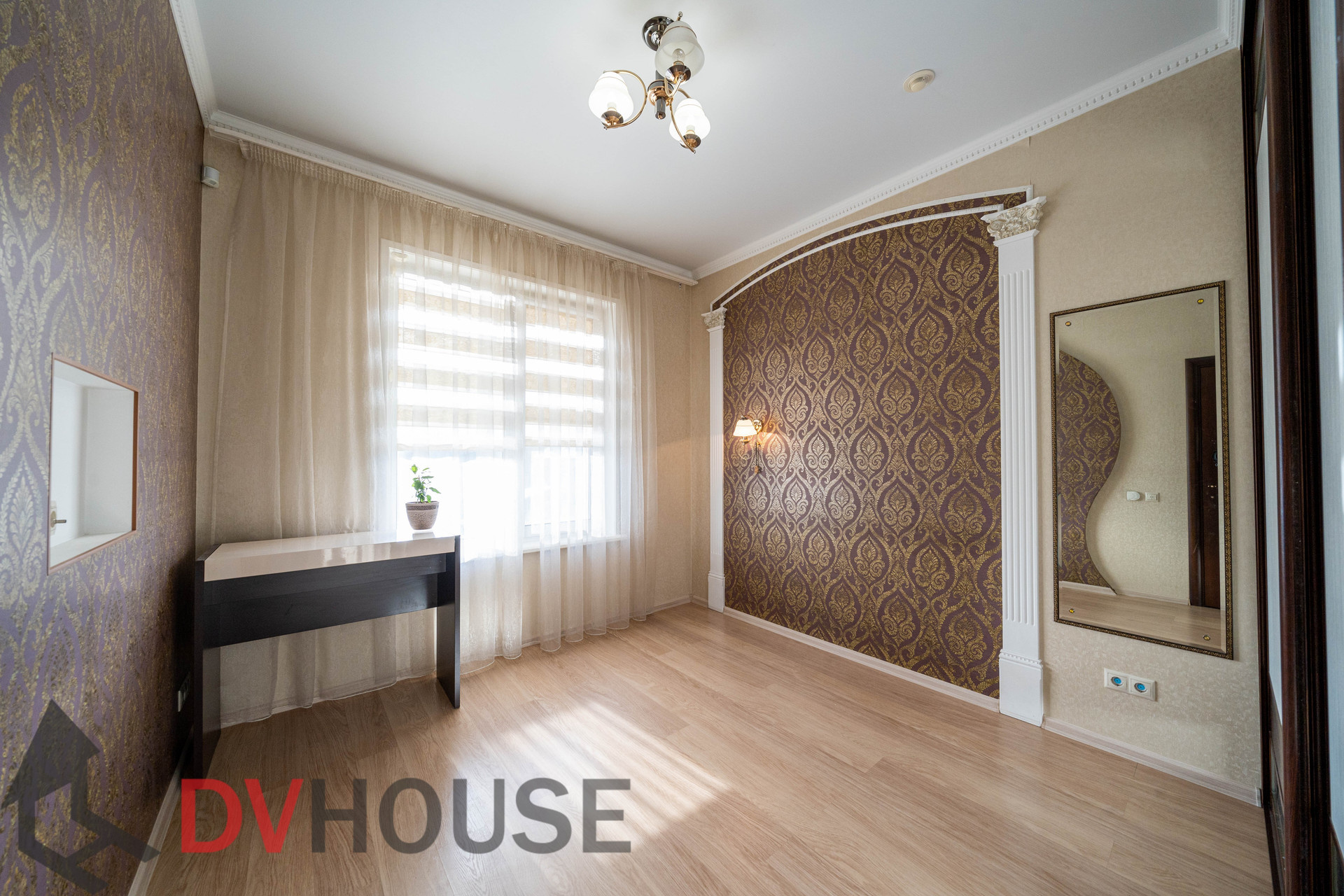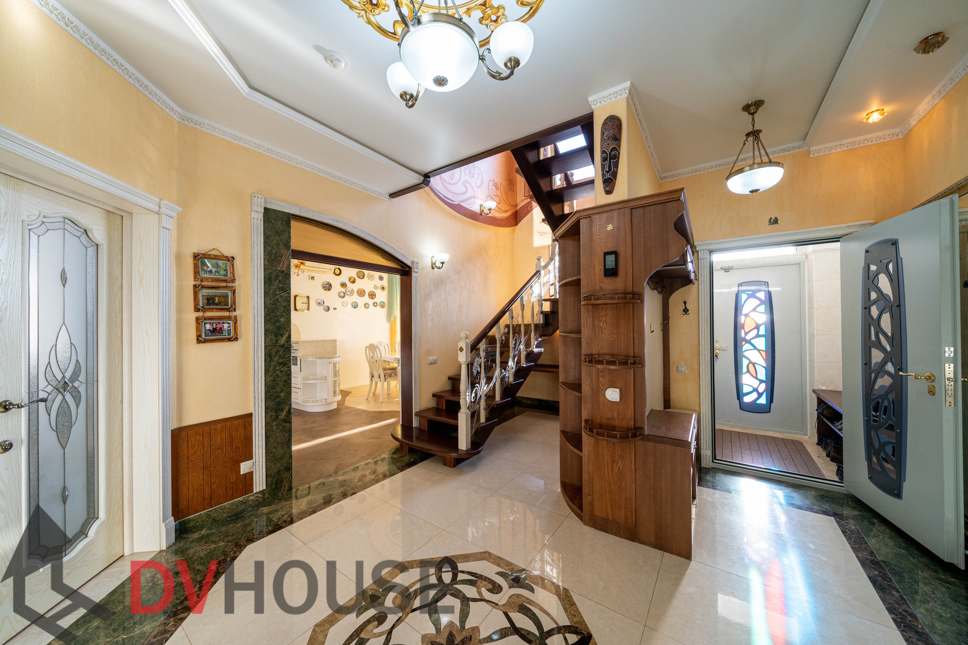На первом этаже расположены: холл, просторная кухня с обеденной зоной, гостиная с камином, сауна, комната отдыха, санузел, бойлерная, гараж на две машины. На втором – 4 спальни, кабинет, санузел и гардеробная.