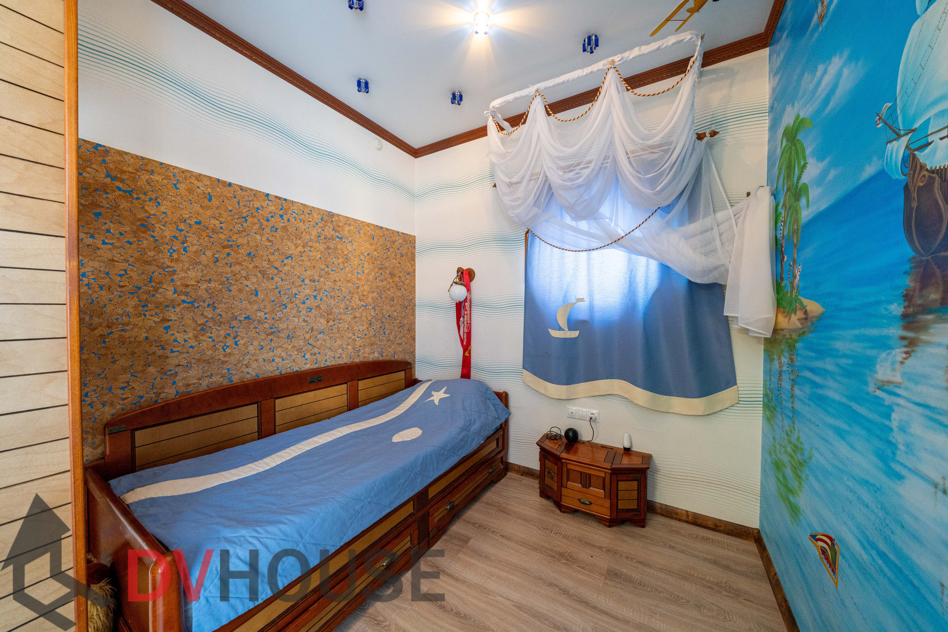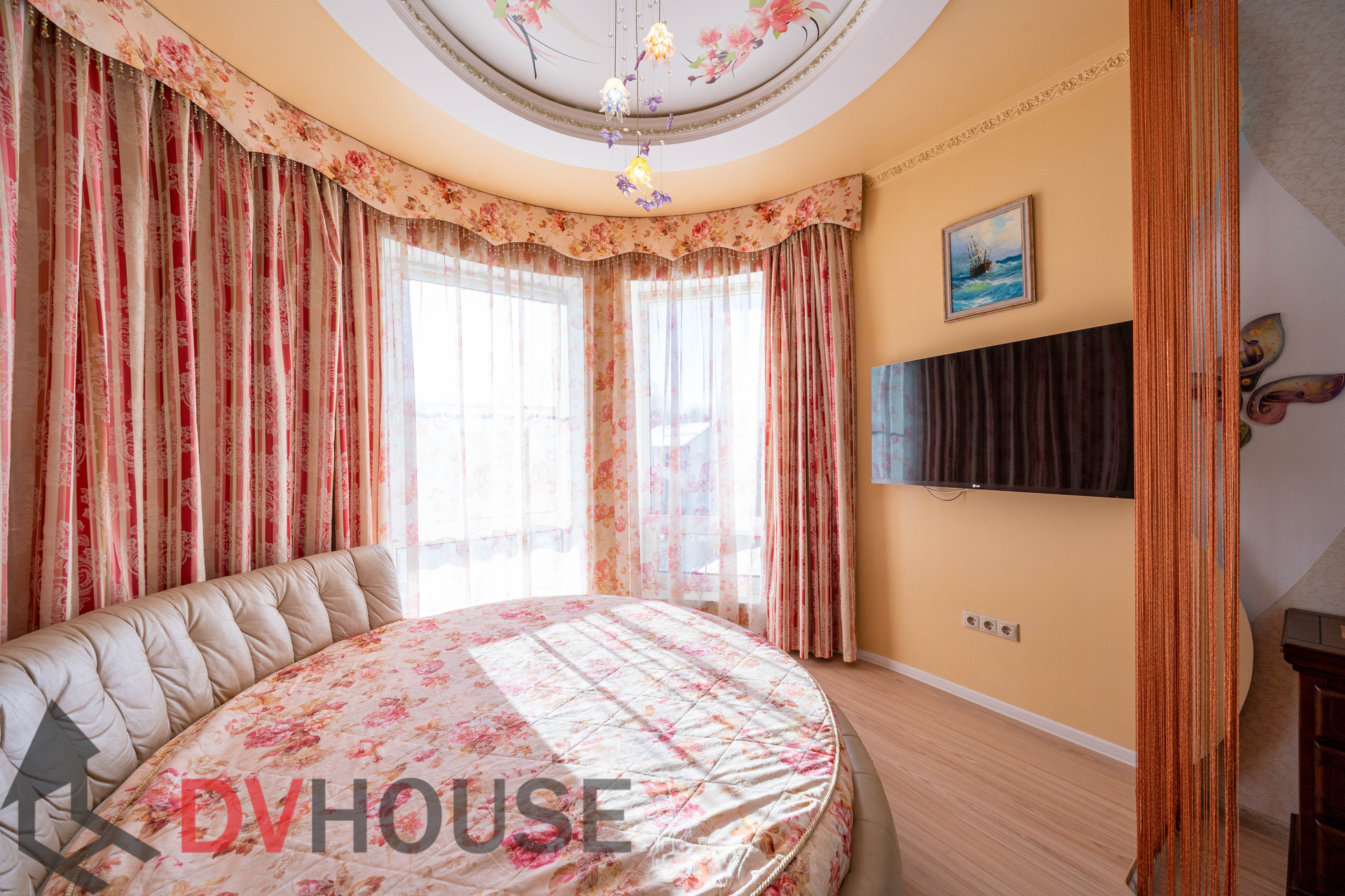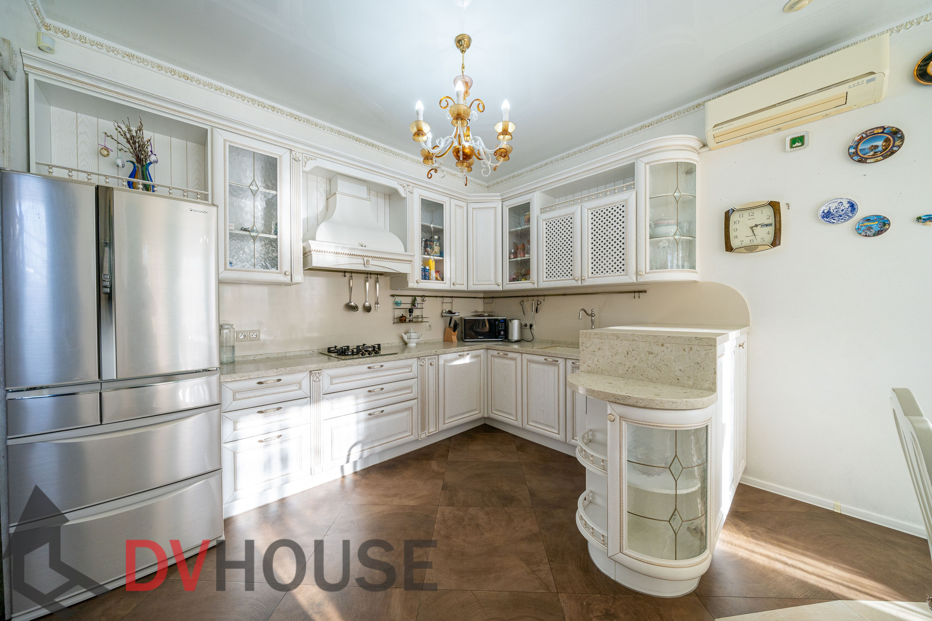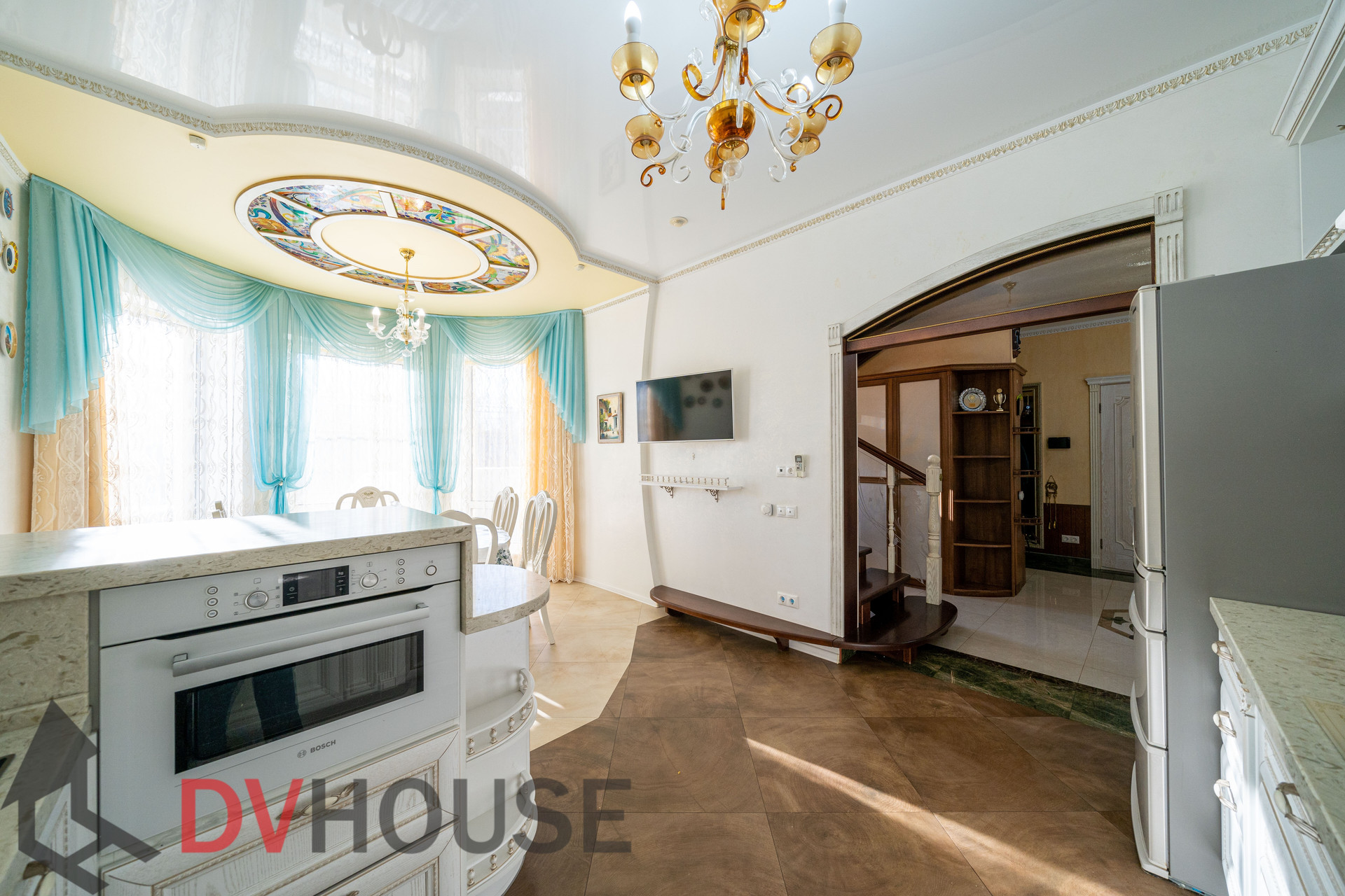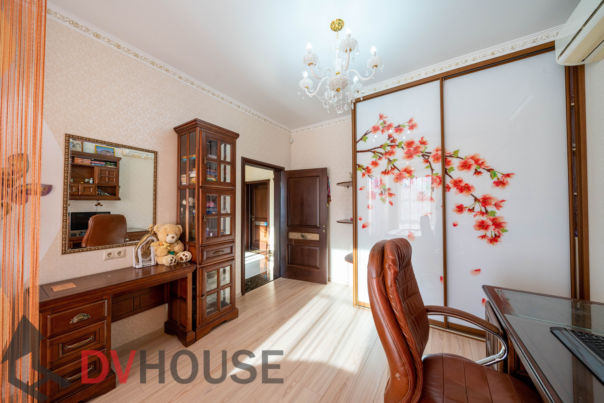 На первом этаже расположены: холл, просторная кухня с обеденной зоной, гостиная с камином, сауна, комната отдыха, санузел, бойлерная, гараж на две машины. На втором – 4 спальни, кабинет, санузел и гардеробная.